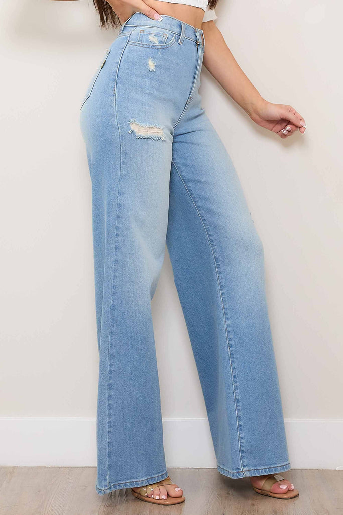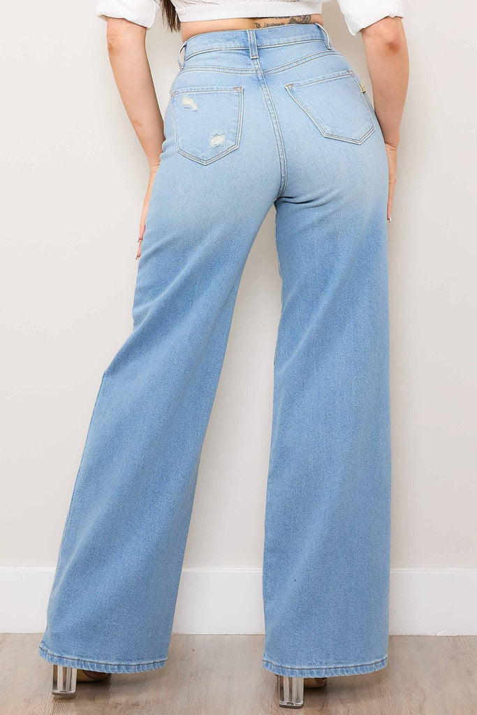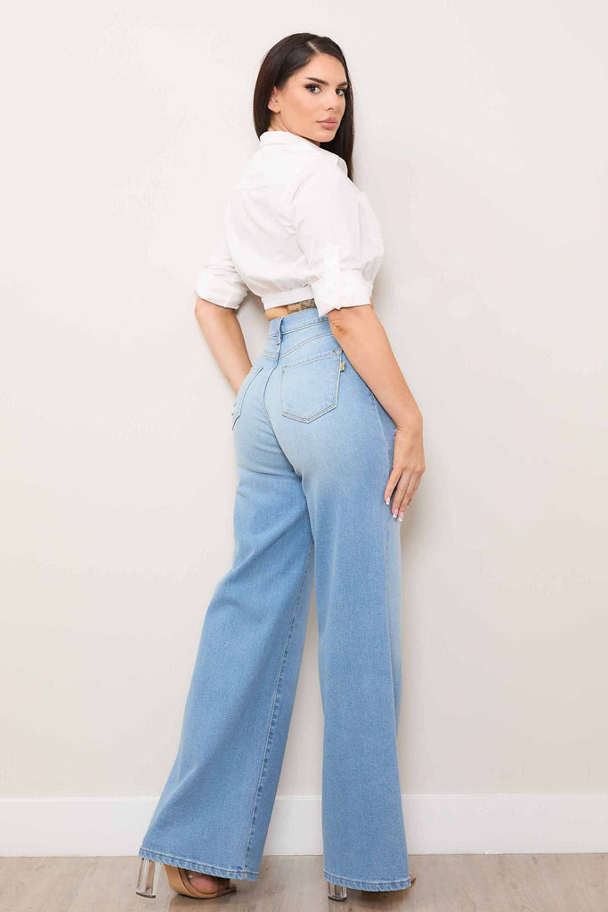 A pair of high-rise wide leg jeans featuring centered piping lines, square front pockets, back pockets and a zip-fly closure.