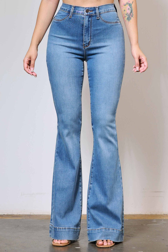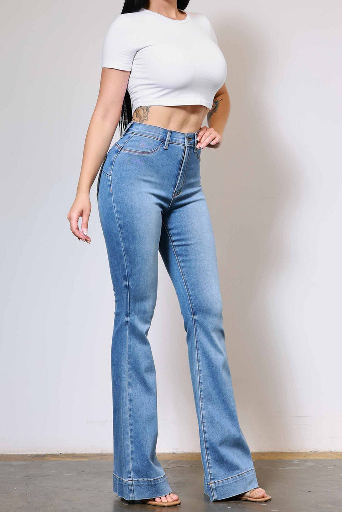 A pair of high rise flare jeans featuring doubled cuff detail, front / back pockets and zip-fly closure.