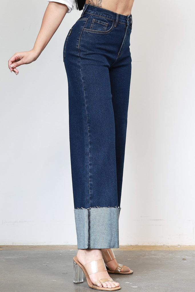 A pair of high-rise wide leg jeans featuring folded cuff with raw edge hem, 5 pocket construction and zip-fly closure.