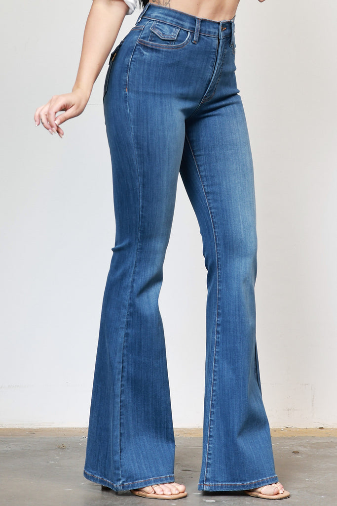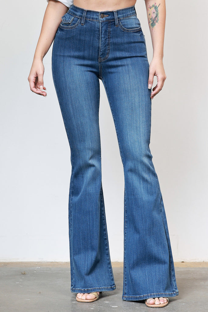 A pair of high-rise flare jeans featuring 5 pocket construction and zip-fly closure.