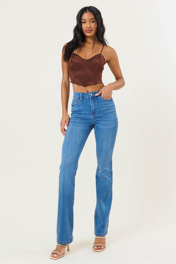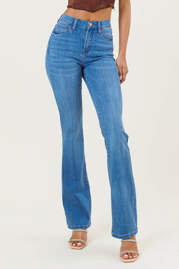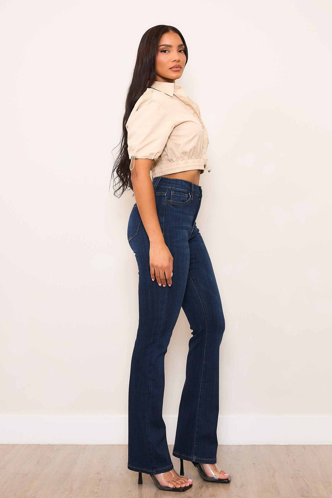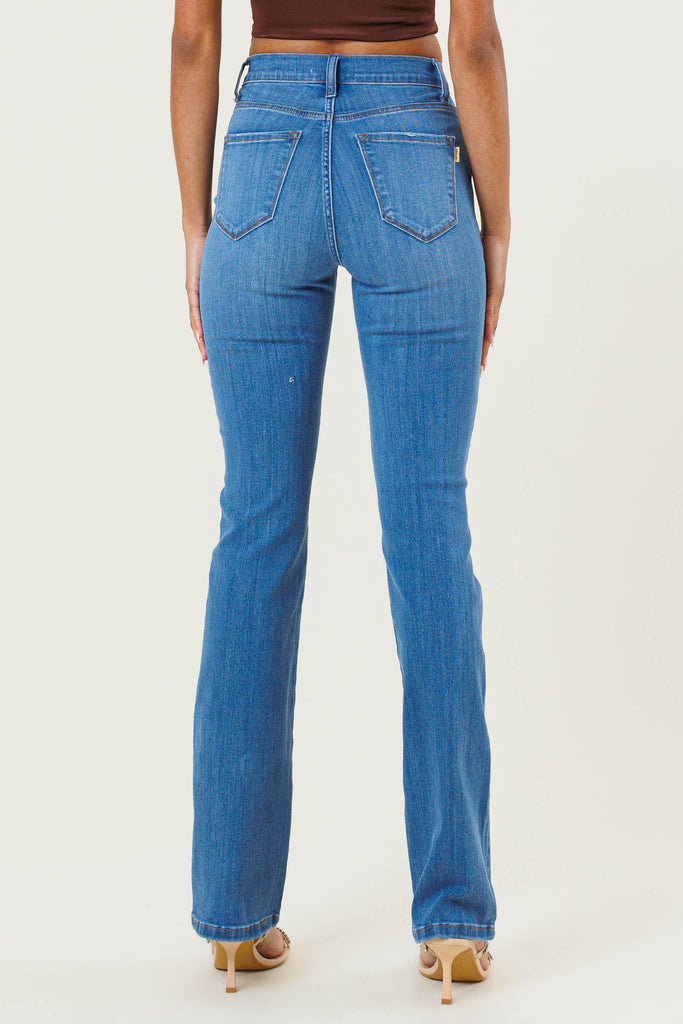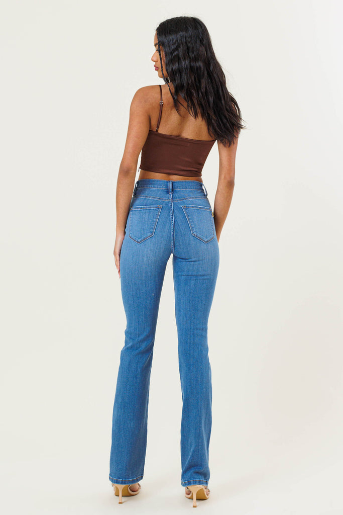 Slim bootcut fit, high-rise jeans featuring wiskered wash, classic 5-pocket construction, and zip-fly closure.
