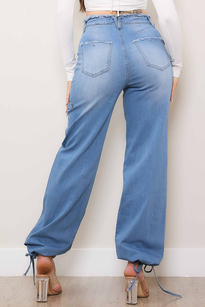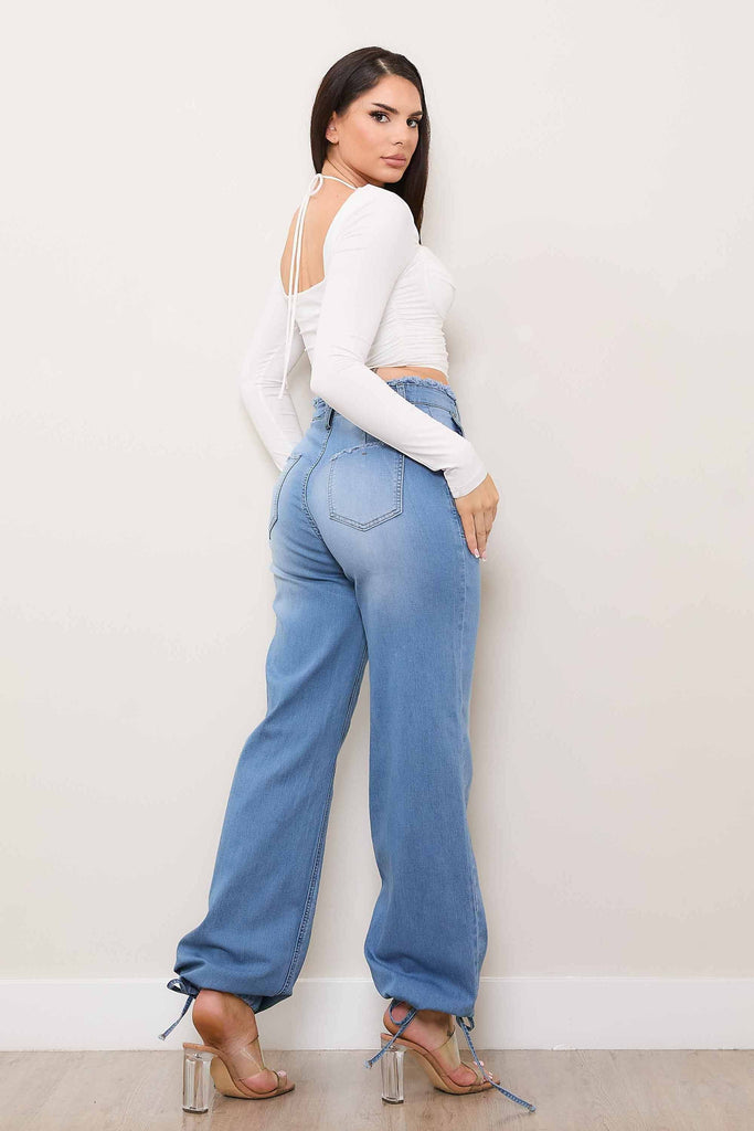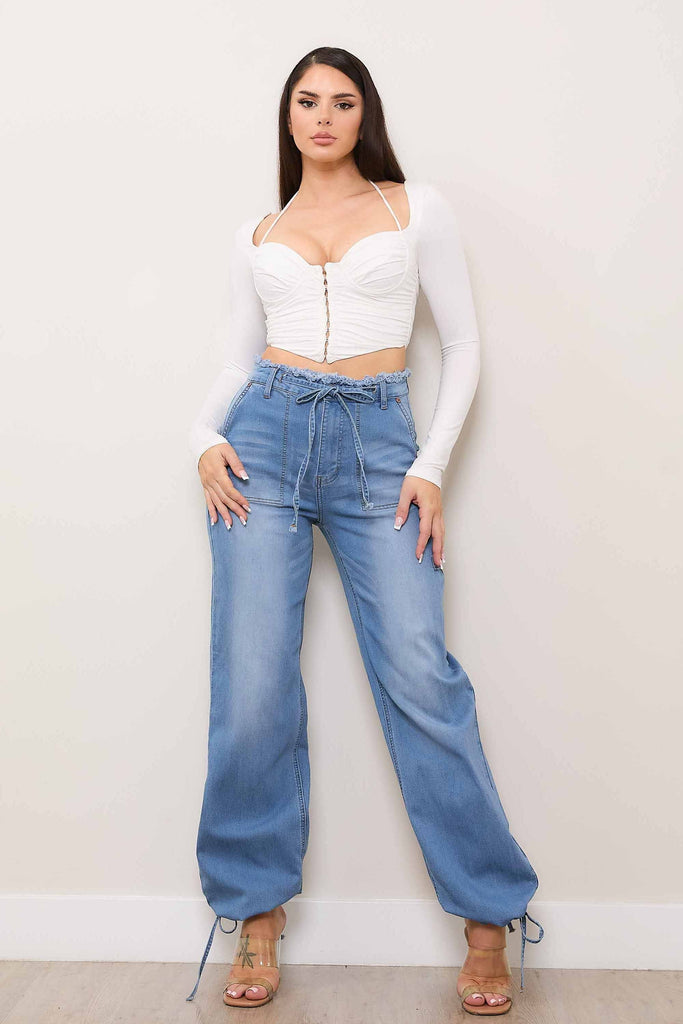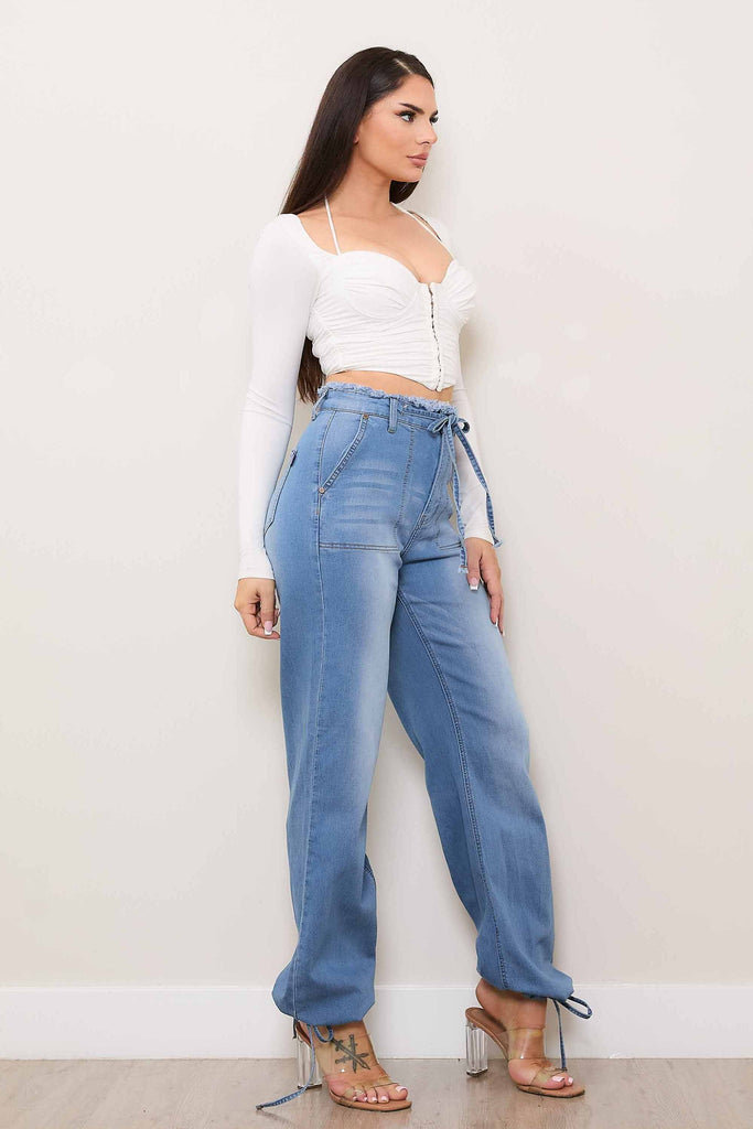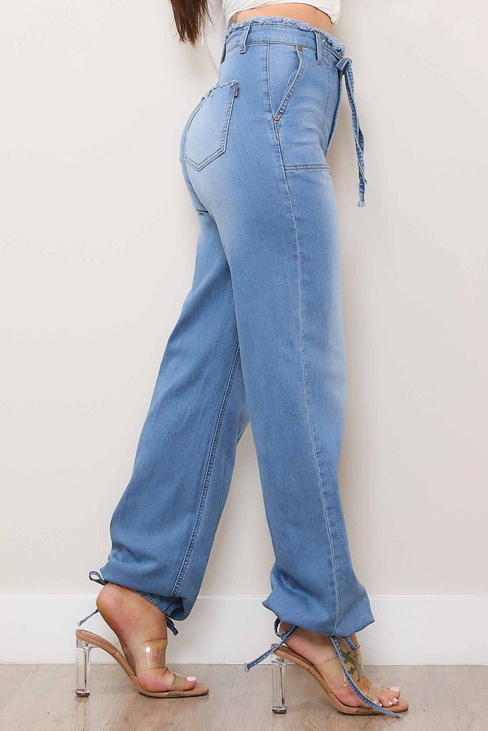 A pair of wide leg jeans featuring raw fringed waist with a detachable string belt, leg opening string details, front & back pockets and a zip-fly closure.