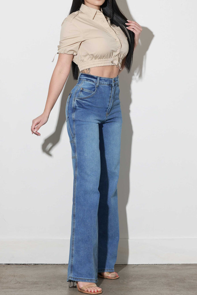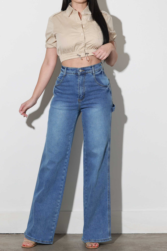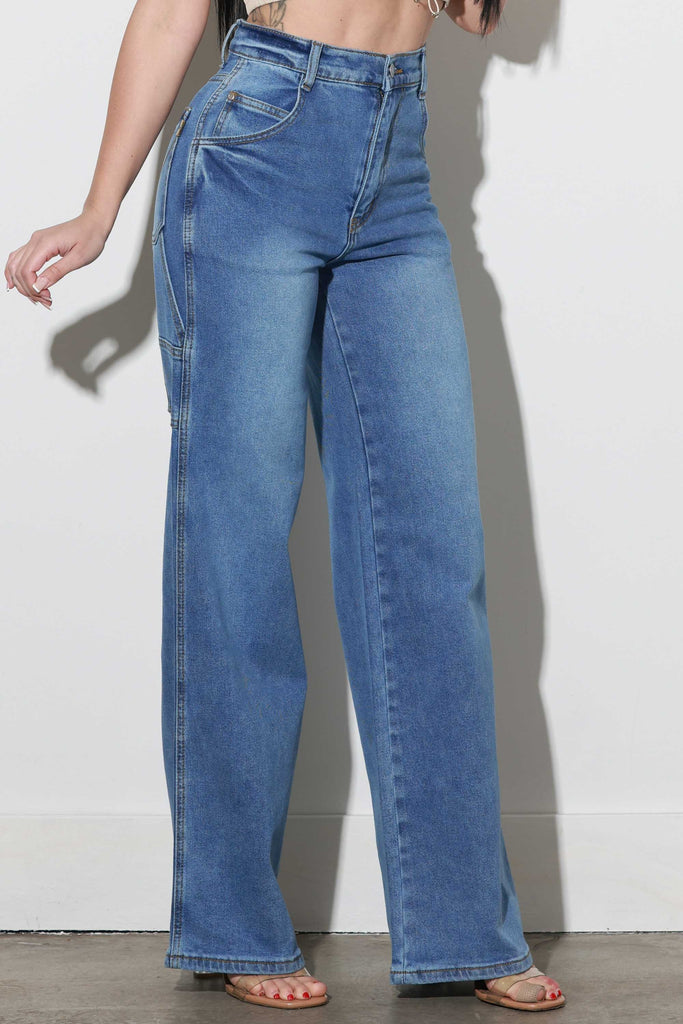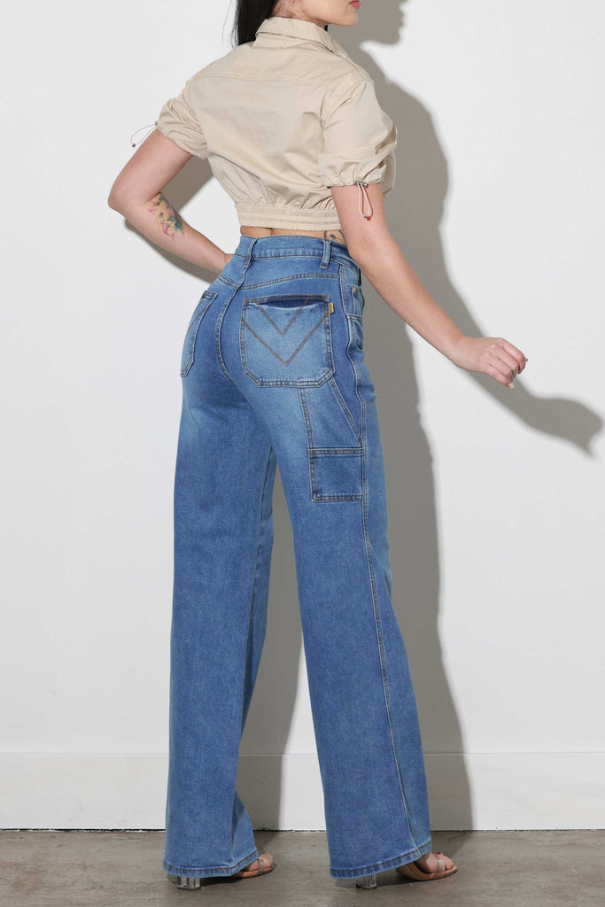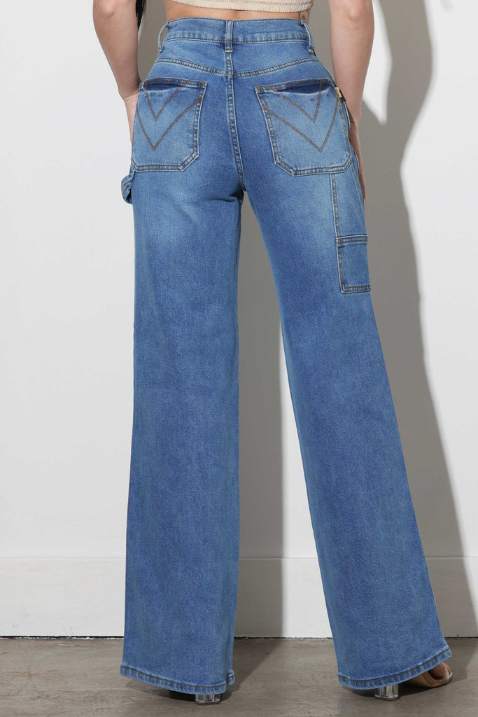 A pair of wide leg jeans featuring a side hammer loop, side mini pockets, a classic 5-pocket construction with V-stitched back pockets and a zip-fly closure.