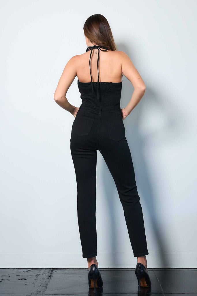 A denim jumpsuit featuring halter neck strap, back smocking, classic 5-pocket construction and a snap-button closure.