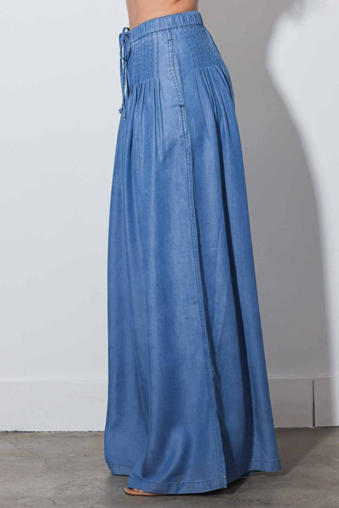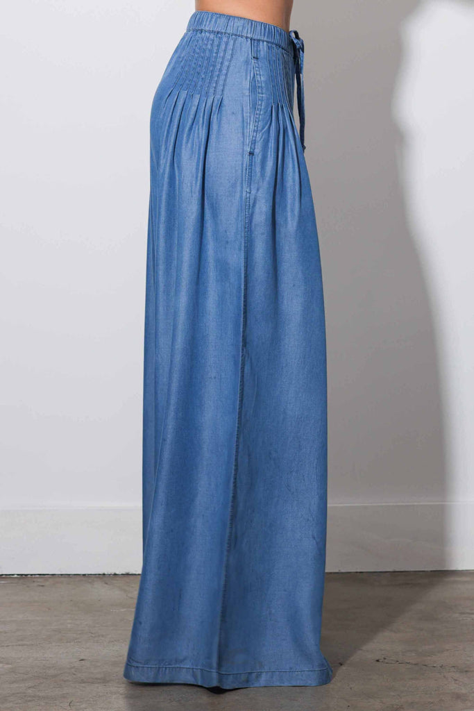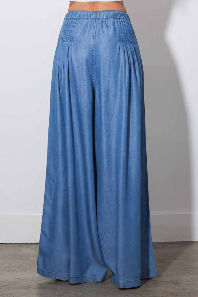 A pair of wide leg palazo featuring elastic waist with draw string, front pockets and a zip-fly closure.