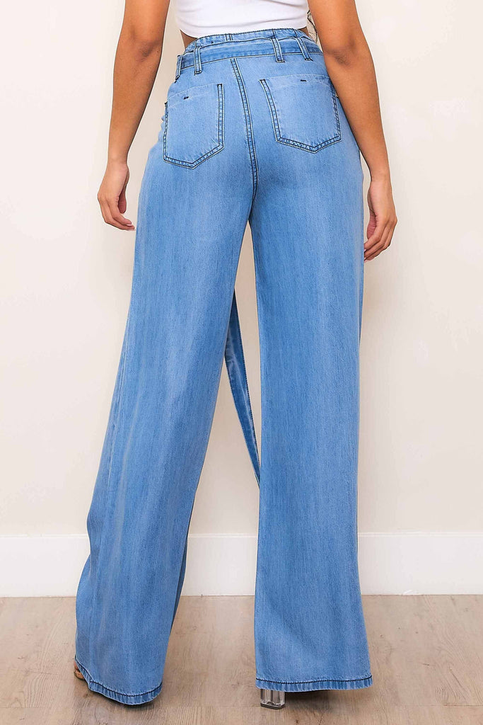 A pair of wide leg TENCEL™ fibers pants featuring a detachable belt, pleated detail waist line, front & back pockets and a zip-fly closure.