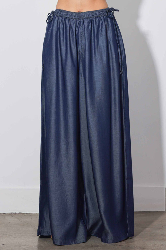 A pair of wide leg palazo featuring elastic waist with side ribbon strap detail, front pockets and faux back pockets.