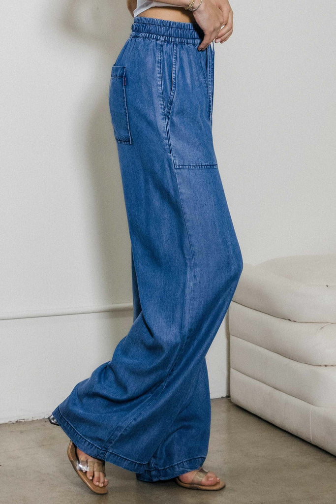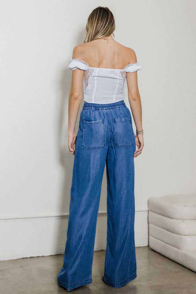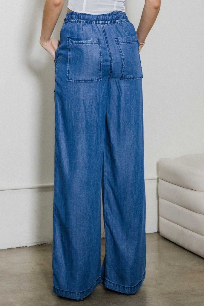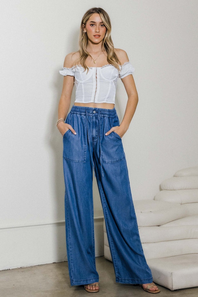 A pair of tencil stright pants featuring elastic waist band with string, front / back pockets and a zip-fly closure.