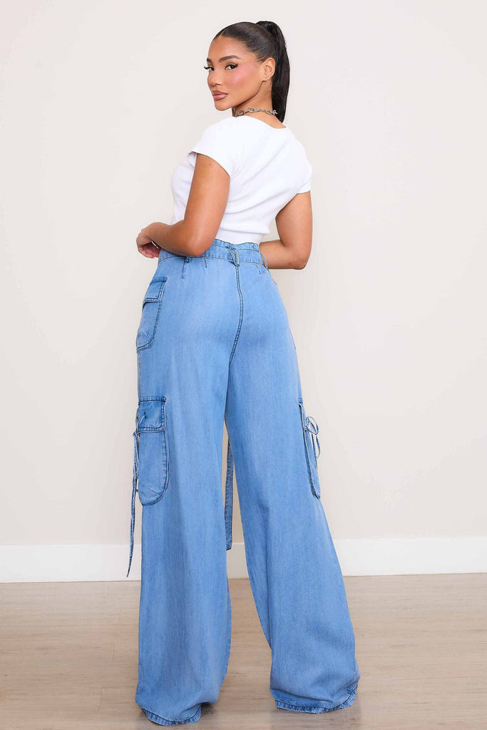 A tencil cargo wide leg pants featuring detachable belted waist, cargo pockets with strings and a zip-fly closure.