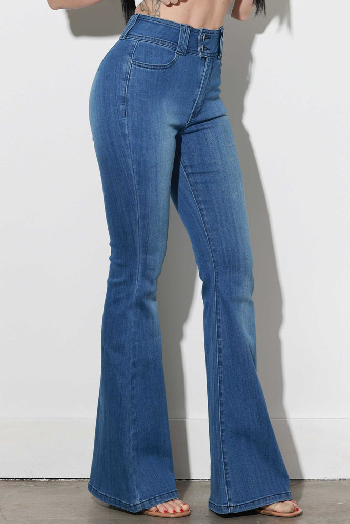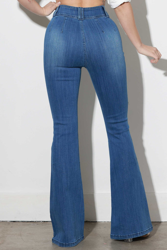 A pair of flare jeans featuring two buttons on the waist, front pockets and zip-fly closure.
