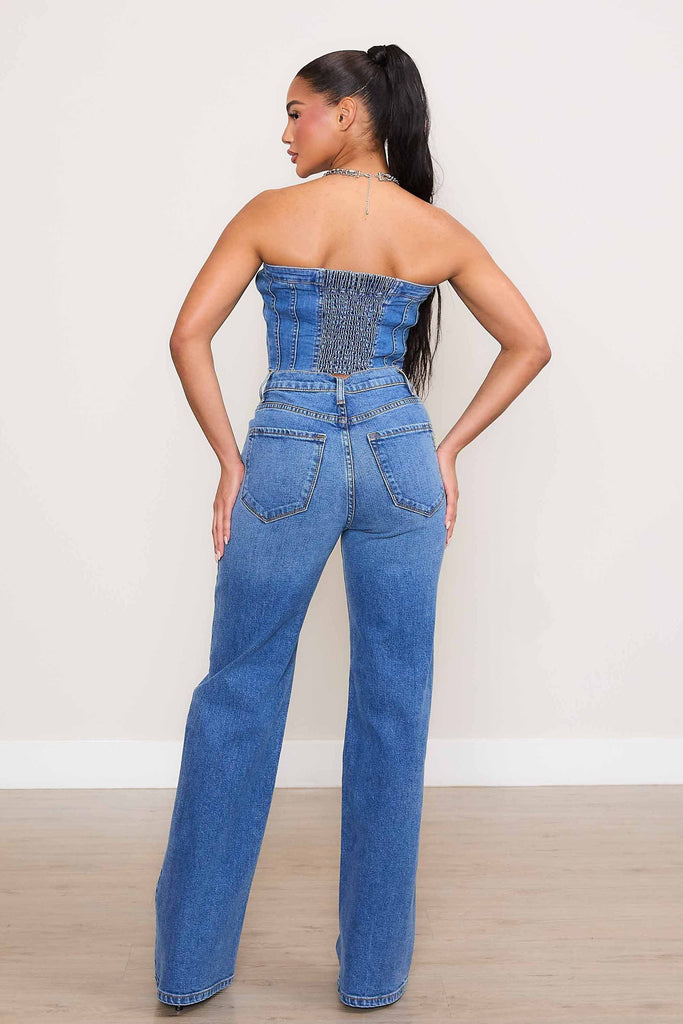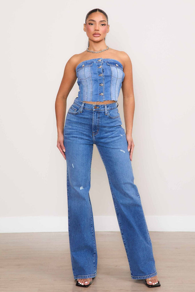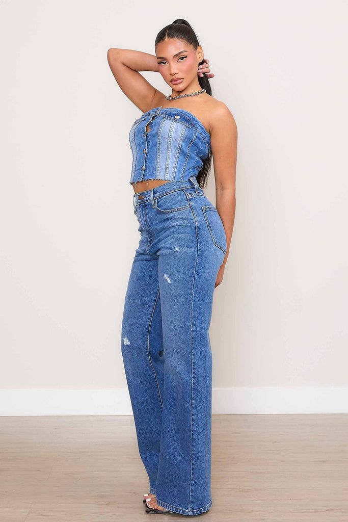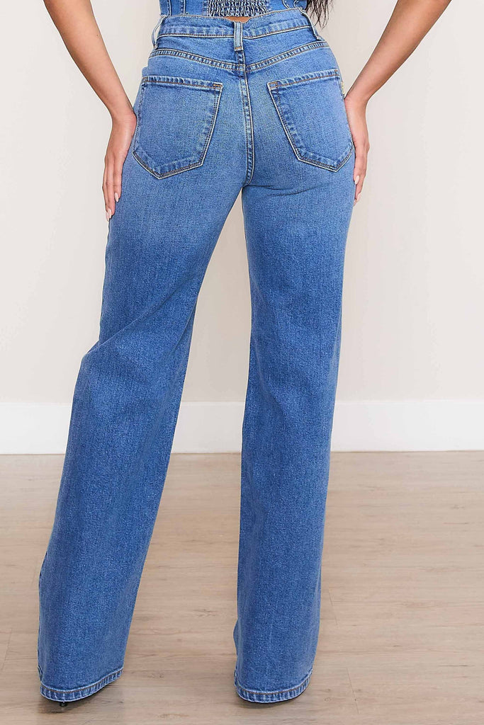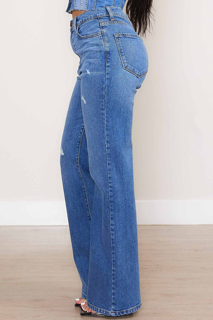 A pair of high-rise wide jeans featuring subtle distressed details, whiskered wash, classic 5-pocket construction and zip-fly closure.