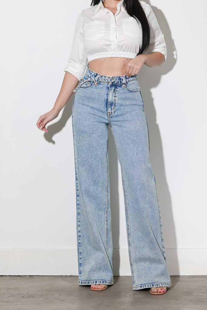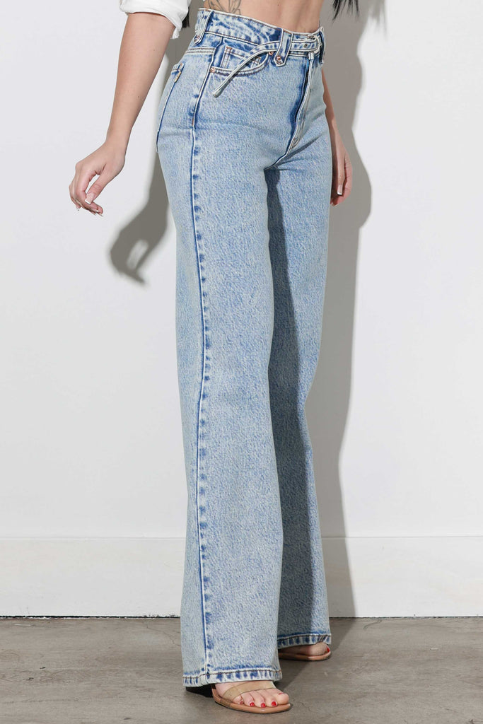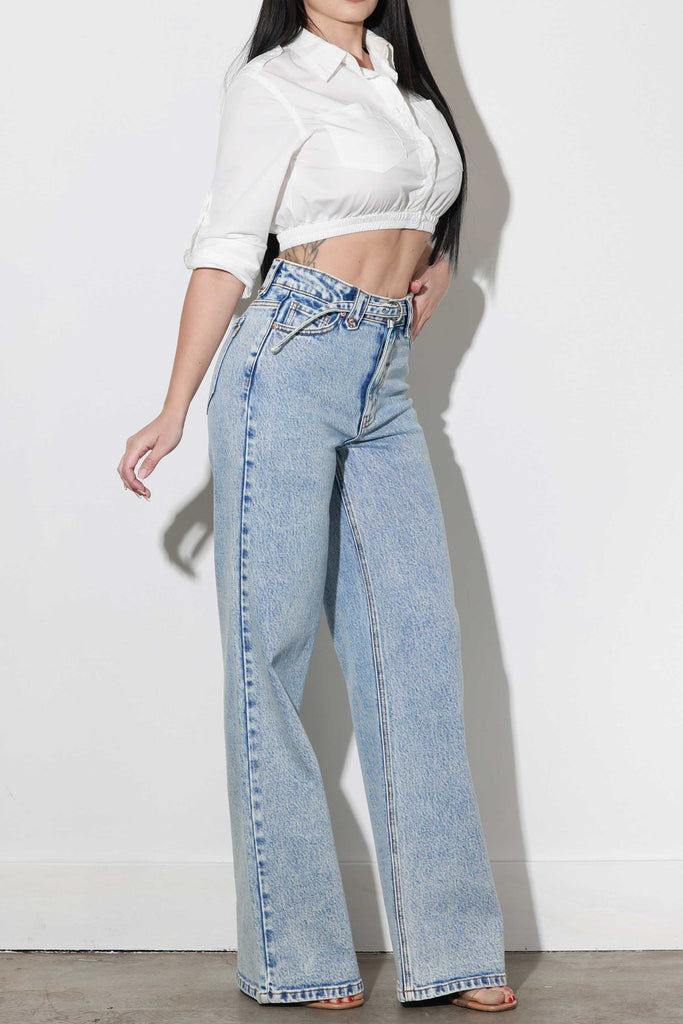 A pair of high rise wide leg jeans featuring detachable waist belt, 5-Pocket construction and zip-fly closure.