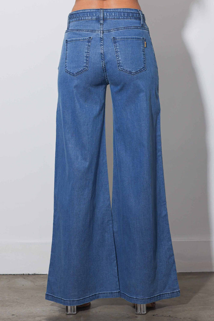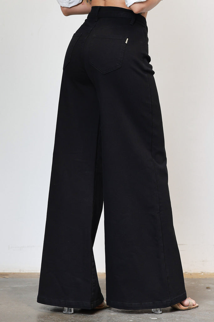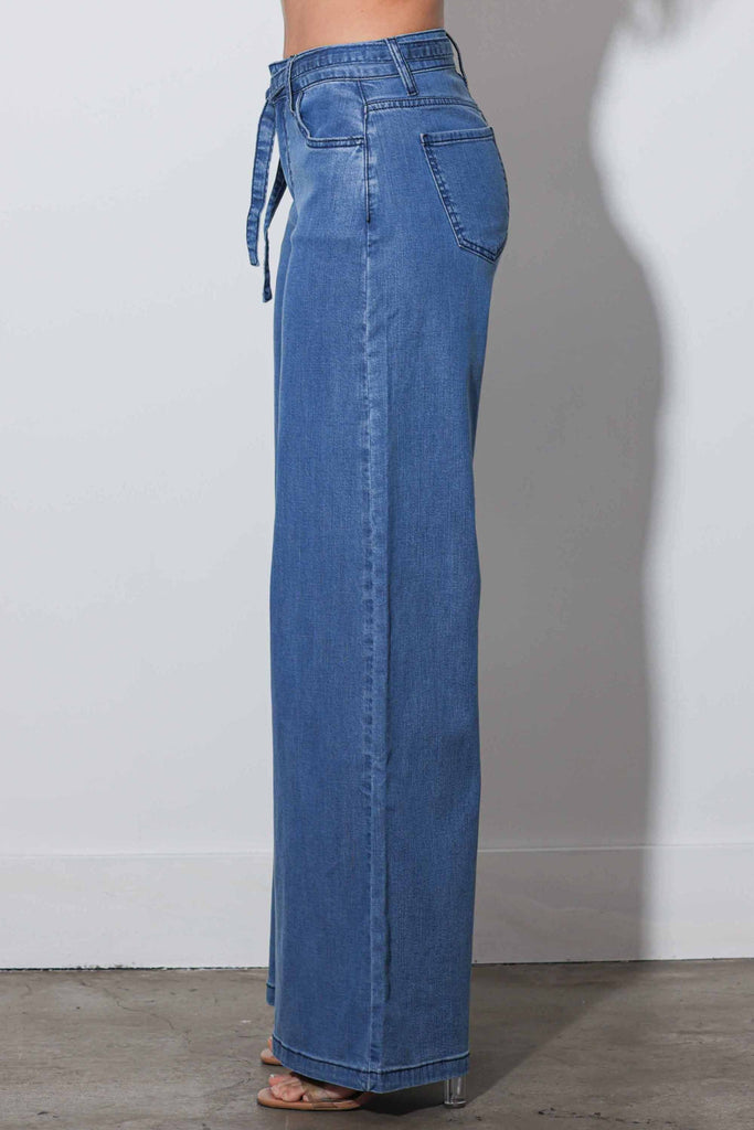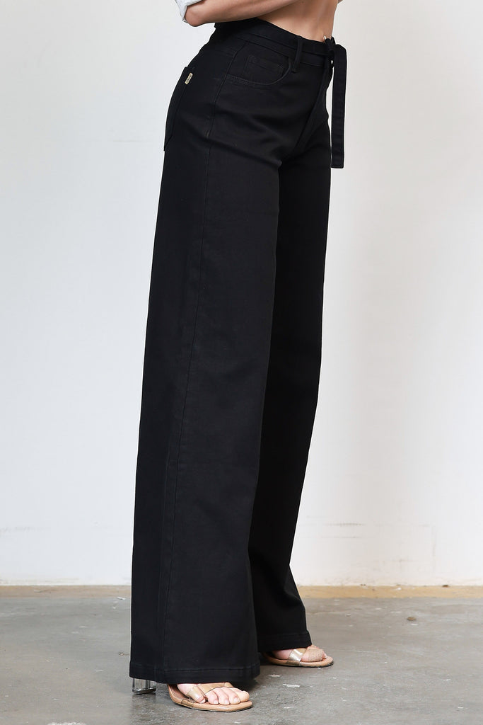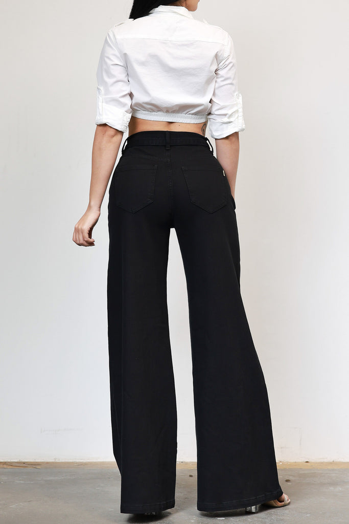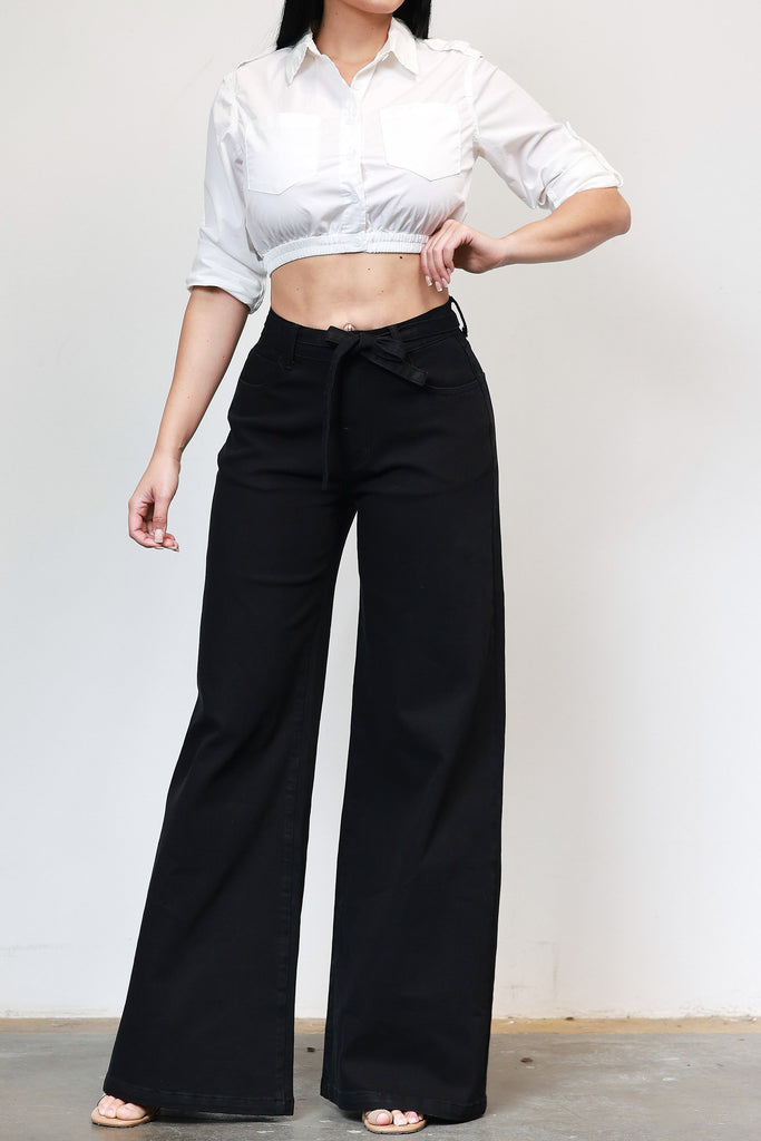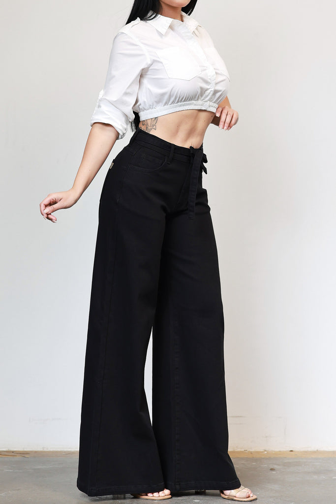 A pair of wide leg pants featuring detachable waist trap, classic 5-pocket construction and zip-fly closure.