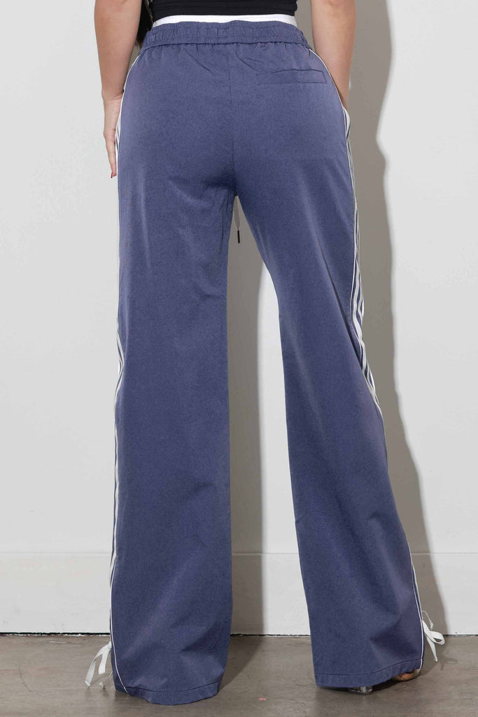 A pair of track pants featuring elastic waist band with draw string, ribbon detail on the side, front & back pocket.