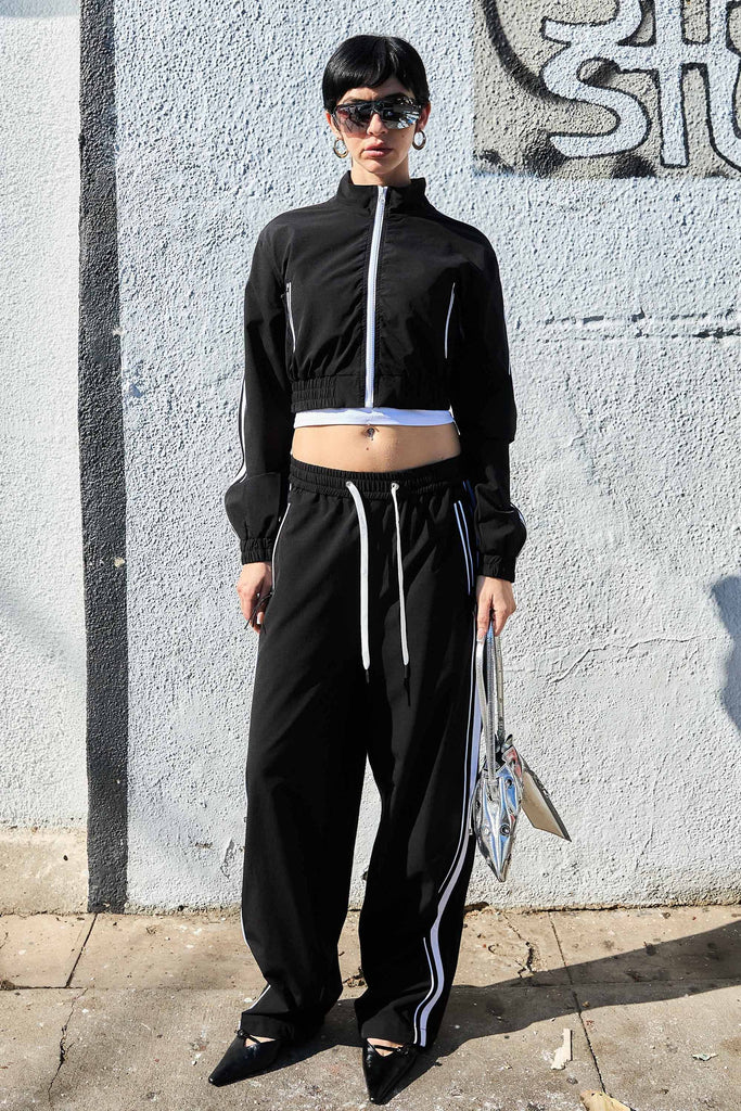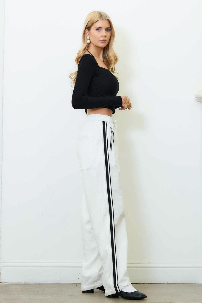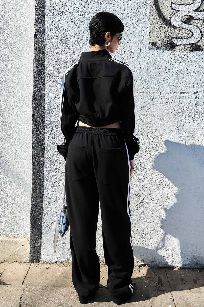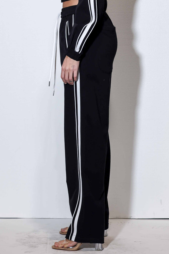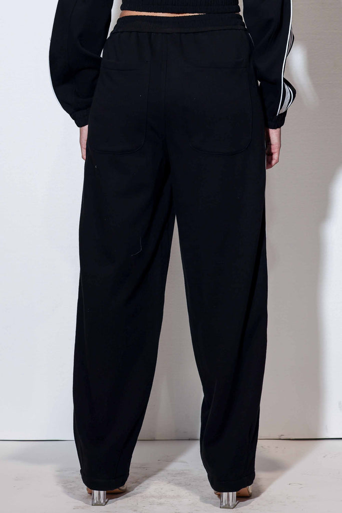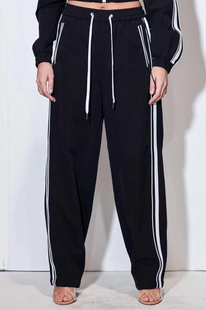 A pair of baggy track pants featuring elastic waist with drawstring and front & back pockets.