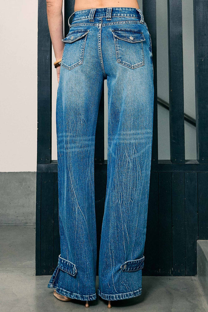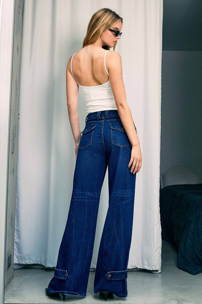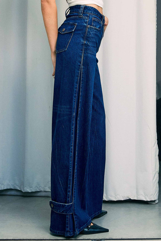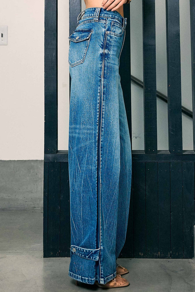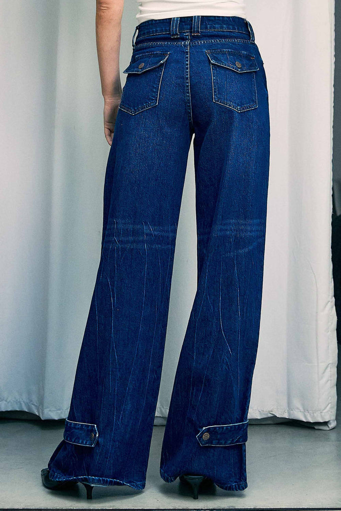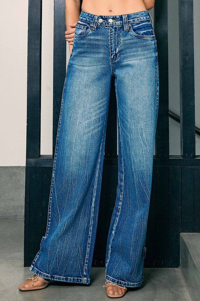 A pair of mid-rise wide leg jeans featuring two button waist, adjustable snap buttons for tapered fit, 5 pocket construction and zip-fly closure.