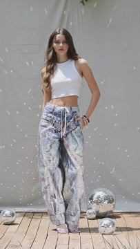 A pair of barrel jeans featuring digital prints all over, draw string on the waist, adjustable snap buttons on the leg opening, 5-Pocket construction and zip-fly closure.