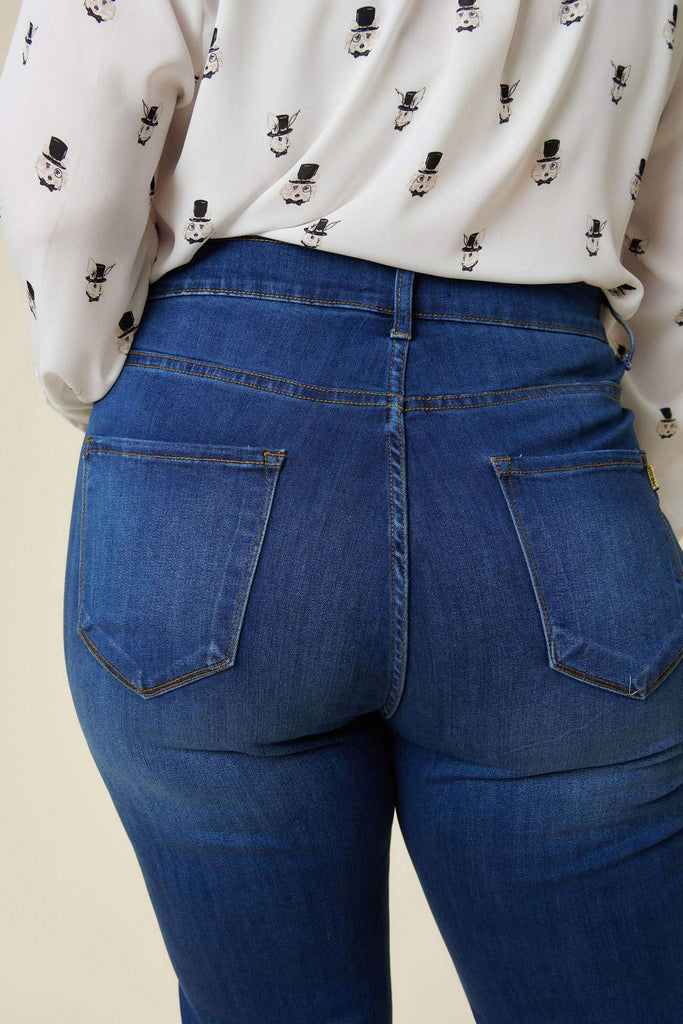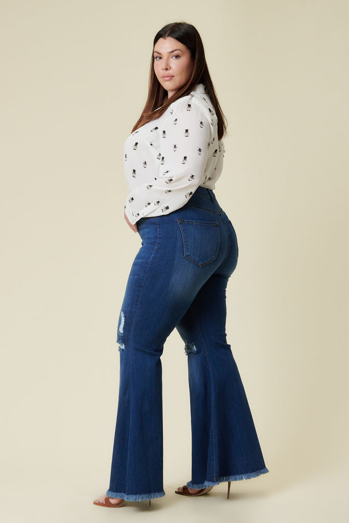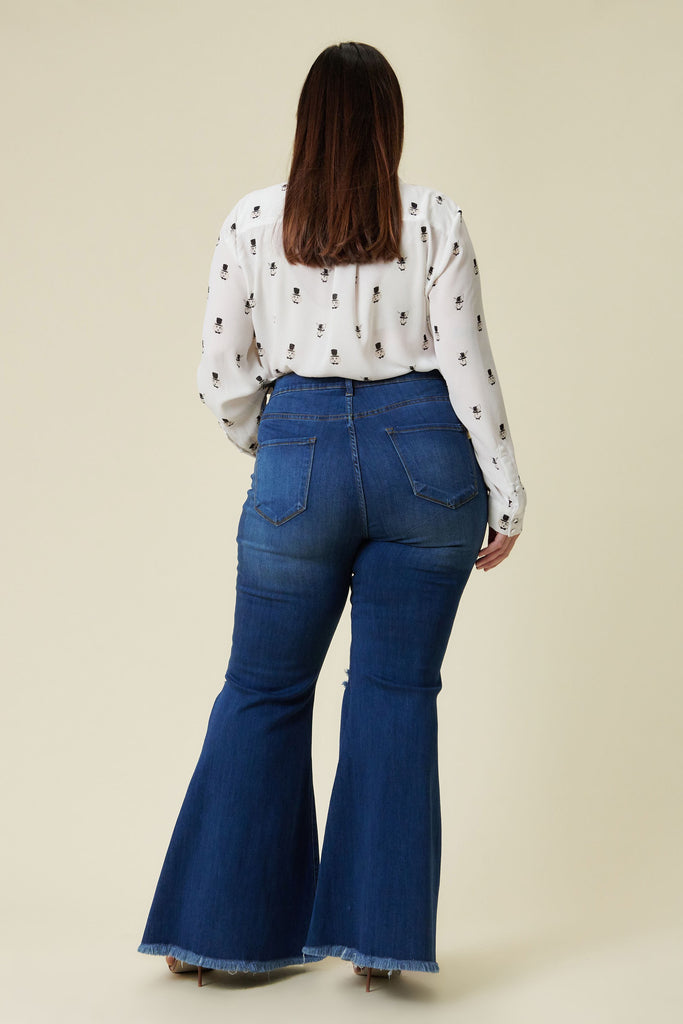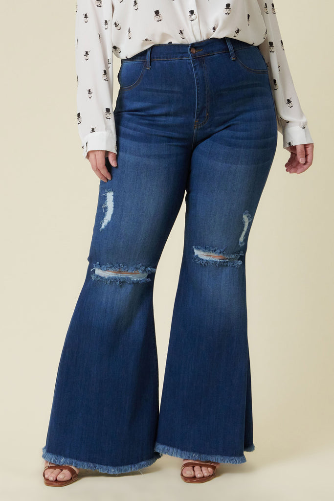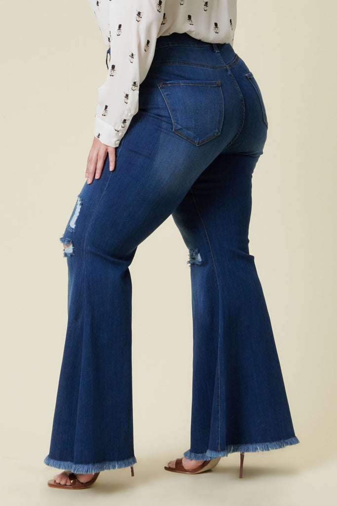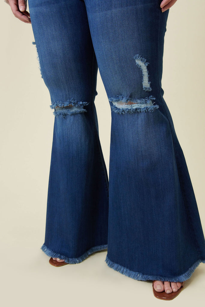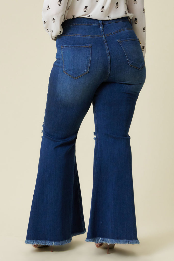A pair of exaggerated, high-rise flare jeans featuring a front whiskered wash, open distressed knee detail, classic 5-pocket construction, frayed raw hem, and a zip-fly closure.