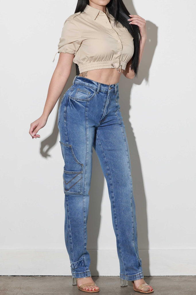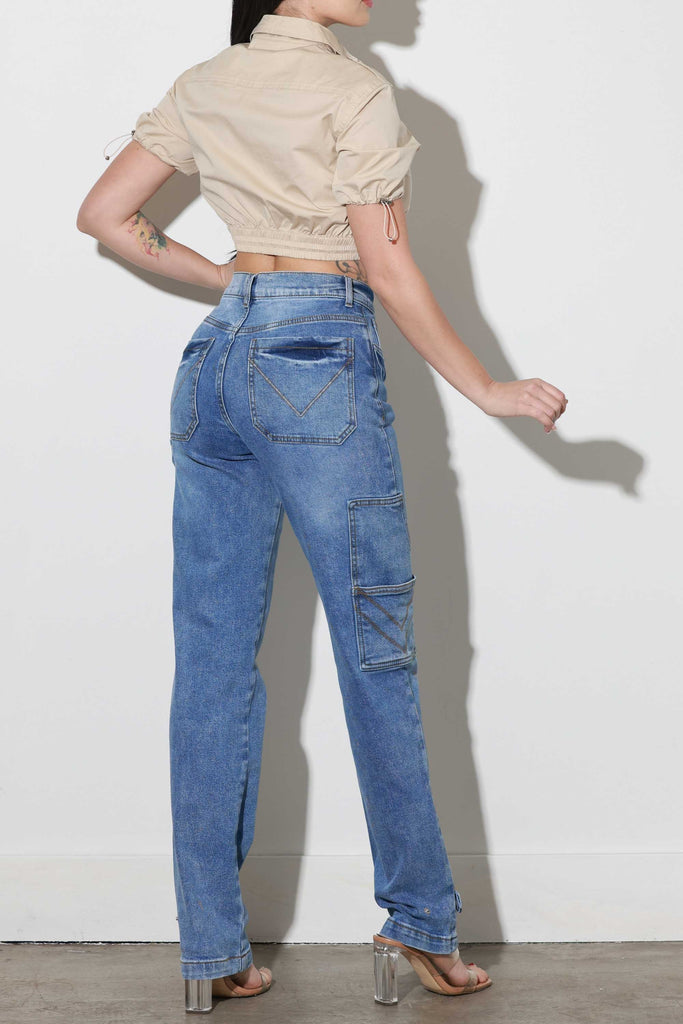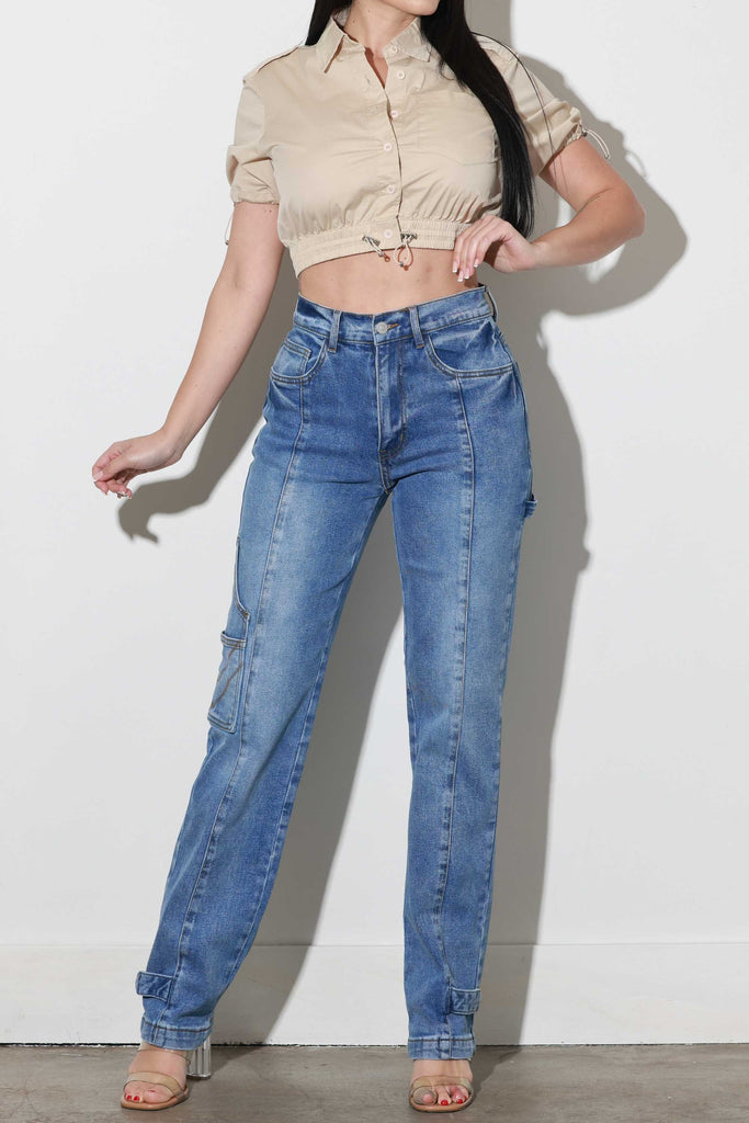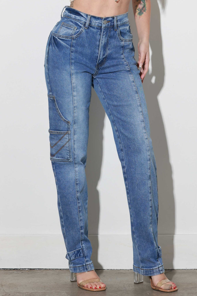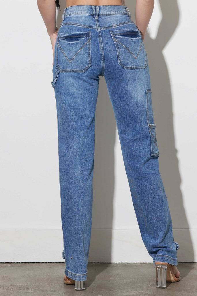 A pair of mid-rise wide baggy jeans featuring capenter pocket, hammer loop, adjustable snap button leg openings, classic 5-pocket construction and a zip-fly closure.