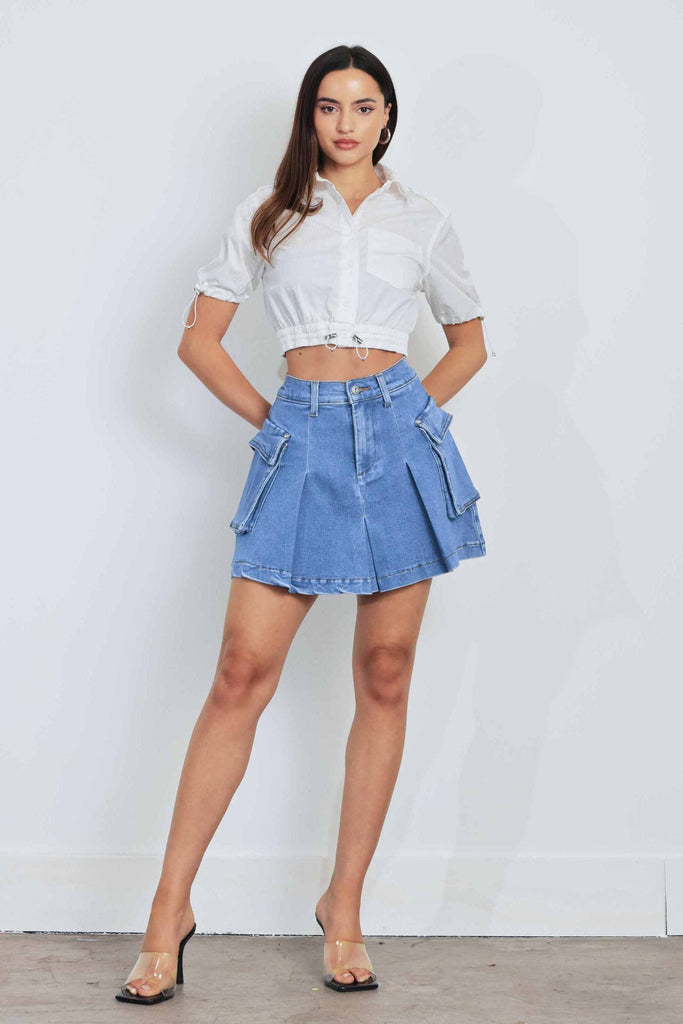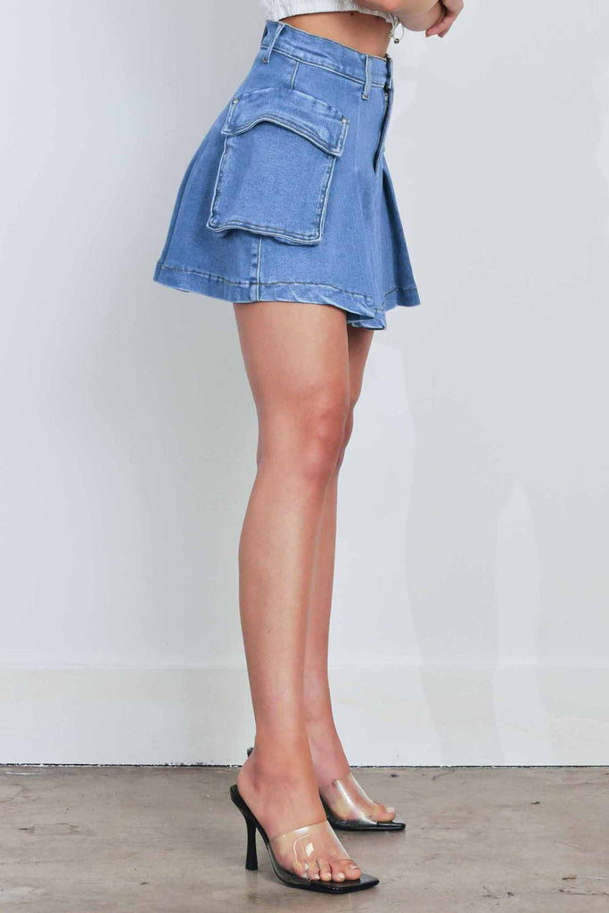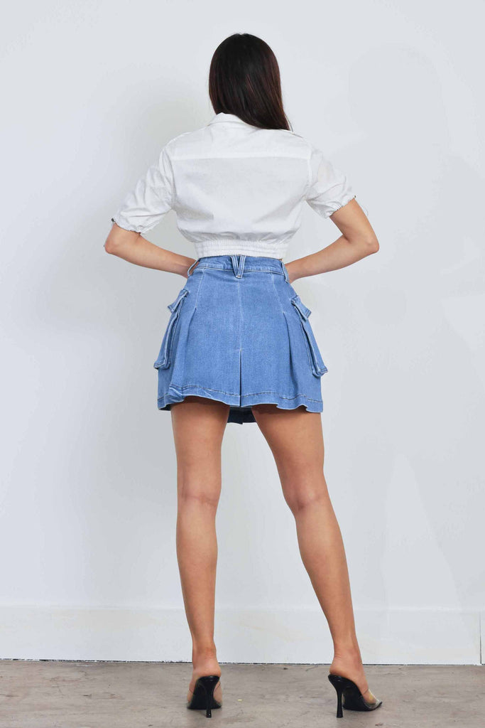A cargo skirt featuring cargo pockets and a zip-fly closure.