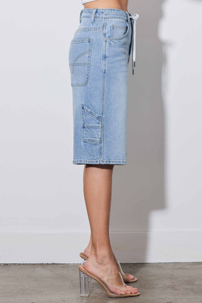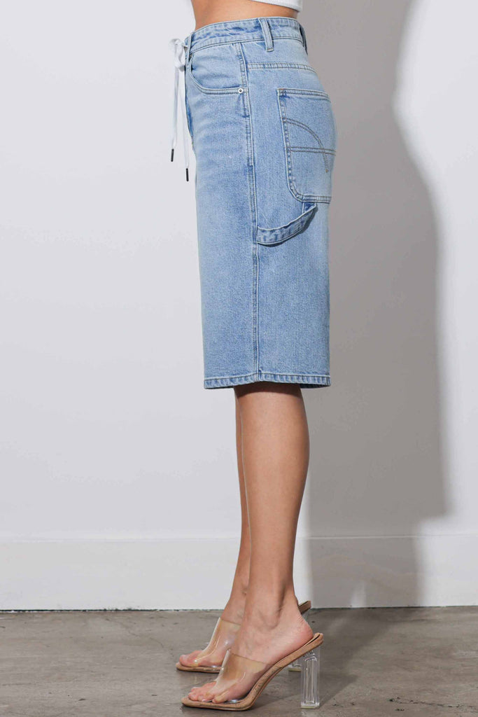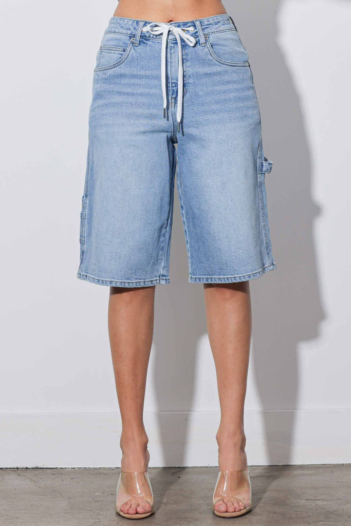 A pair of jorts featuring a small cargo wide pocket, a hammer strap, draw string waist, classic 5-pocket construction and zip-fly closure.