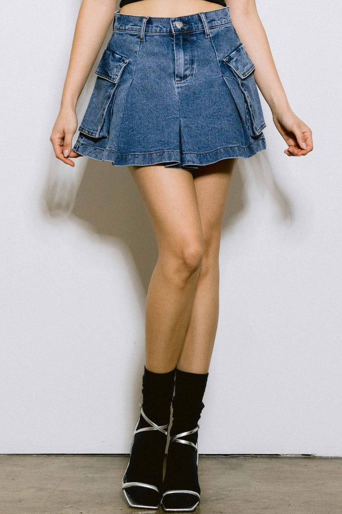 A denim cargo skirt featuring pleated fit, cargo pockets and zip-fly closure.