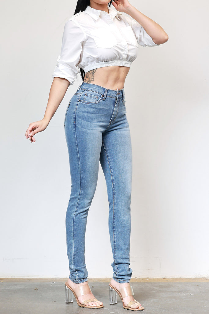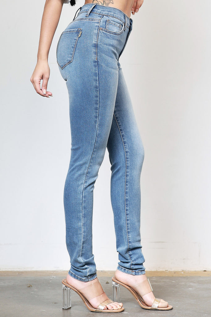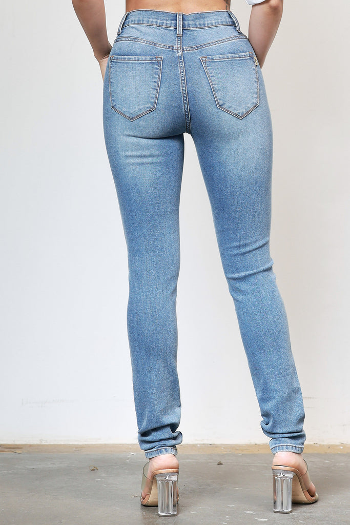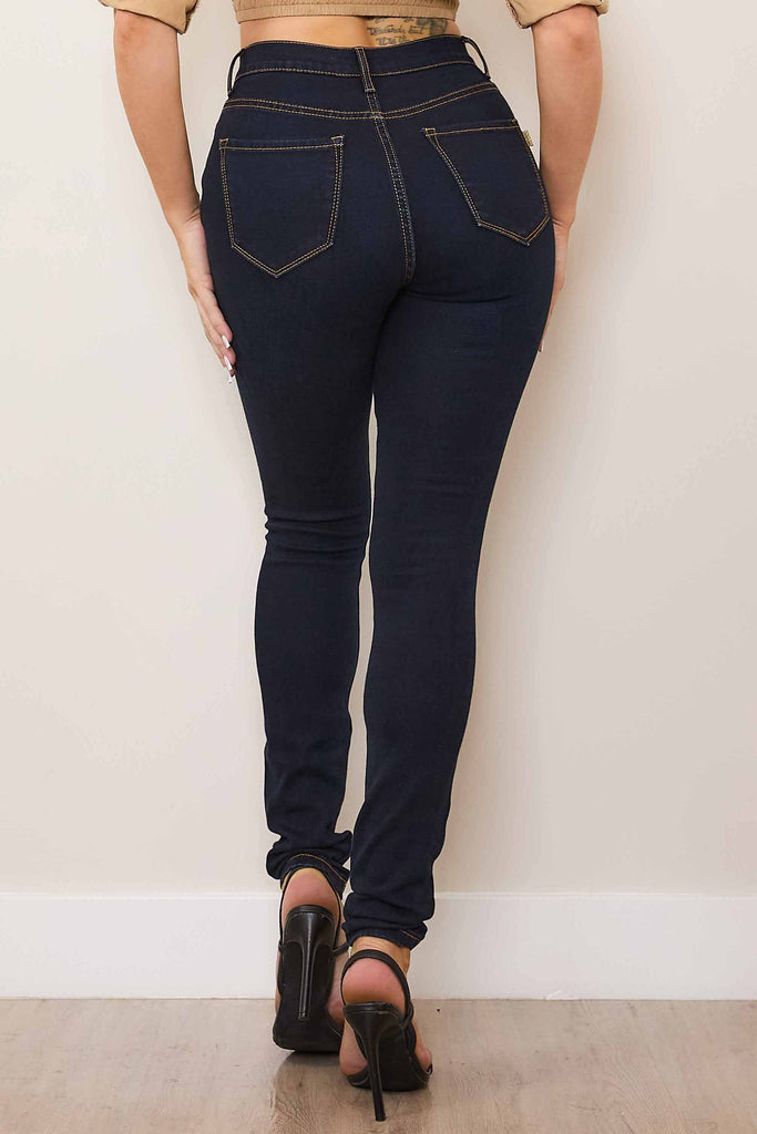 A pair of high-rise skinny jeans featuring contrast stitch color, classic 5-pocket construction and a zip-fly closure.