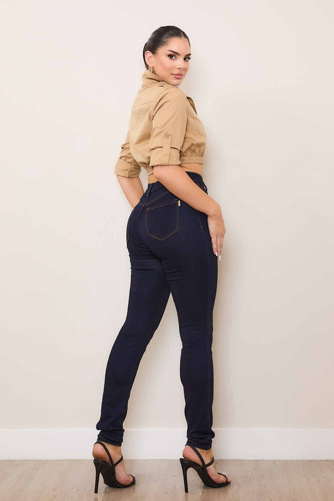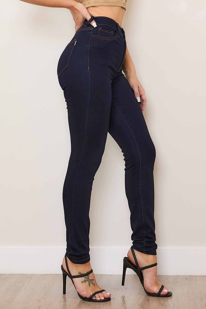 A pair of high-rise skinny jeans featuring classic 5-pocket construction and a zip-fly closure.
