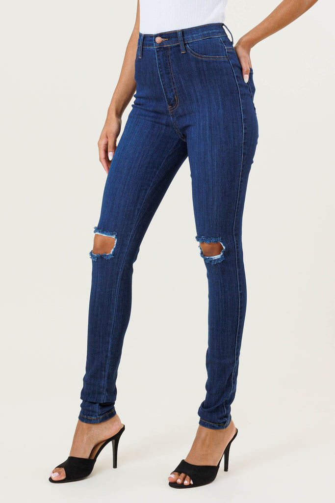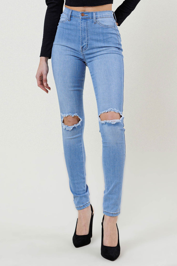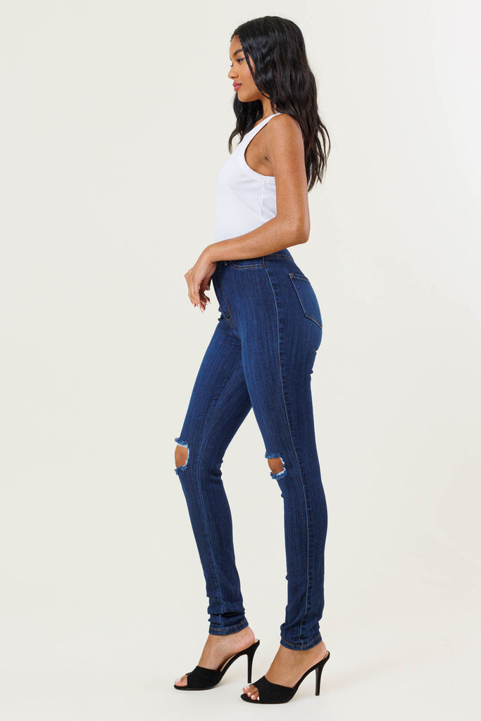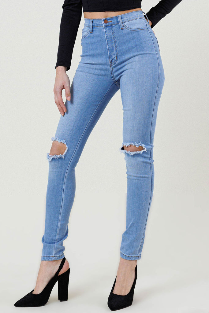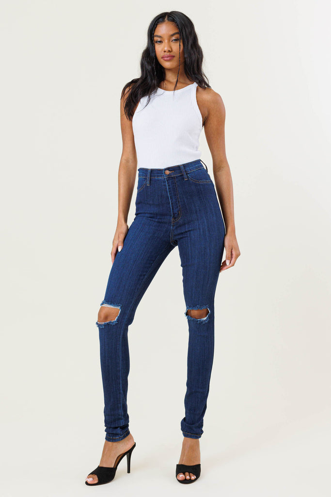 A pair of high-rise skinny jeans featuring front knee distressed details, faux front pockets, two back pockets, and zip-fly closure.