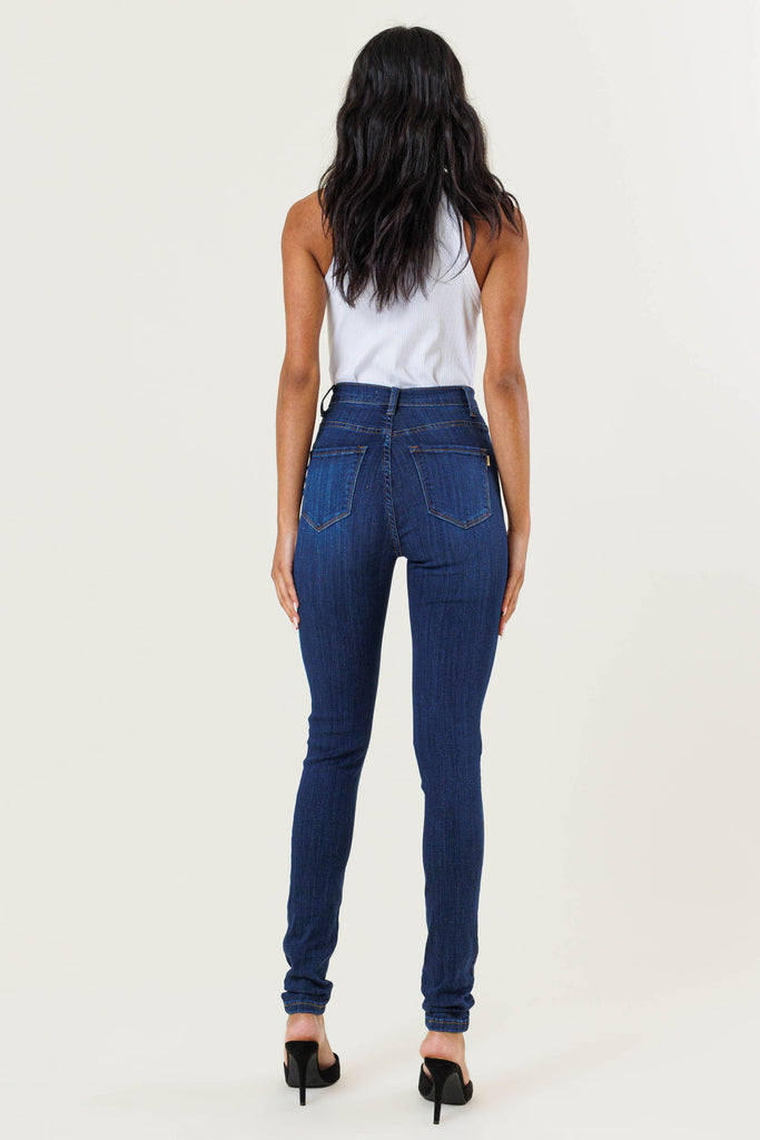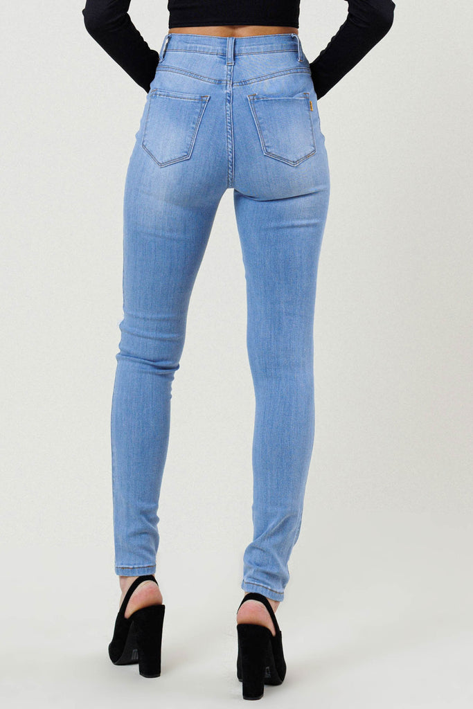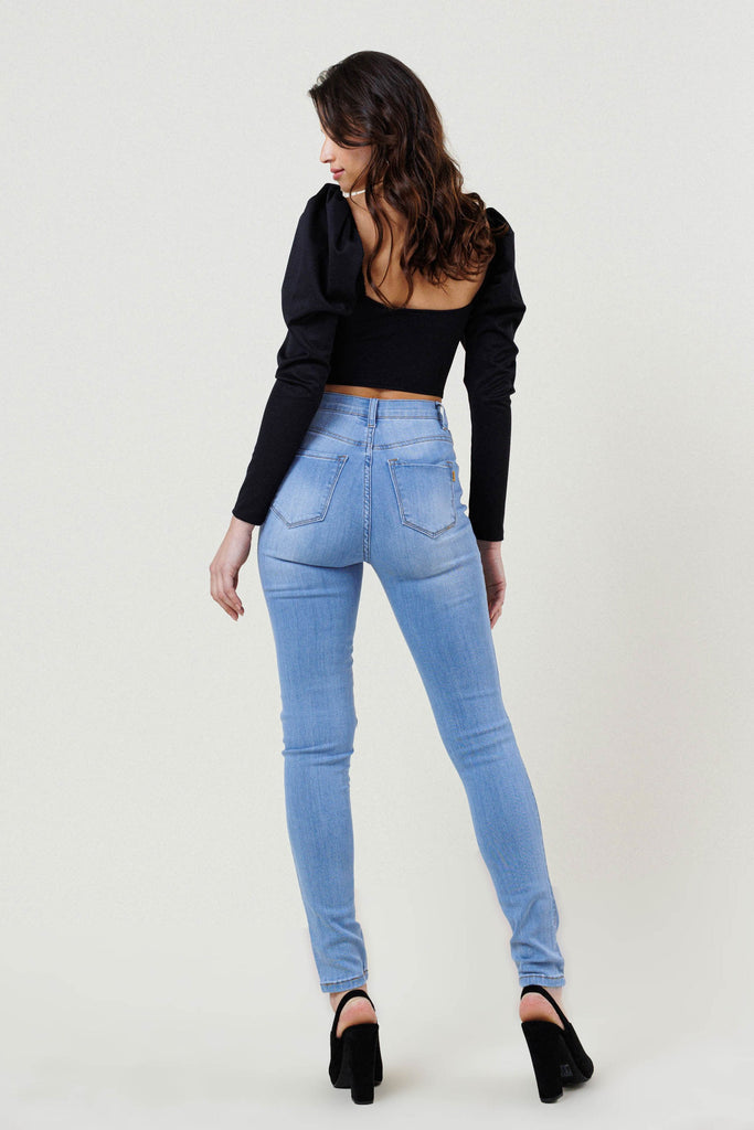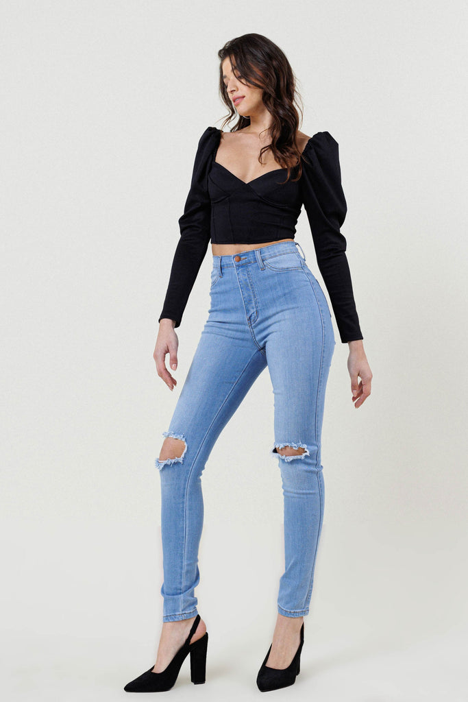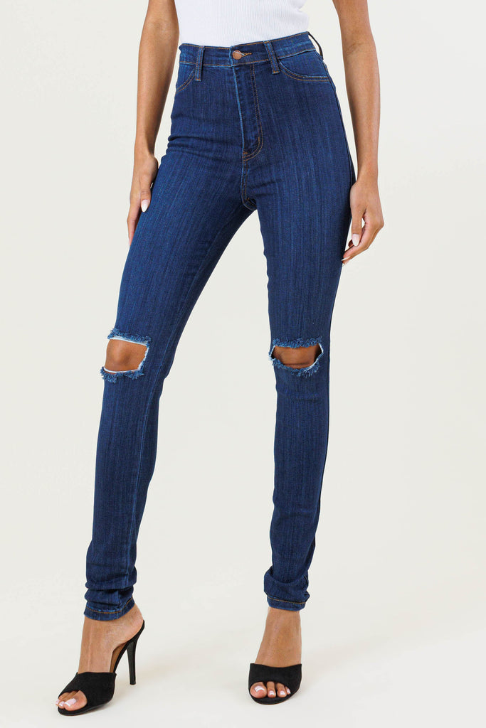 A pair of high-rise skinny jeans featuring front knee distressed details, faux front pockets, two back pockets, and zip-fly closure.
