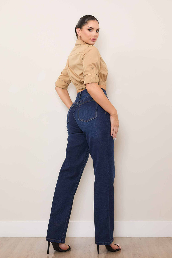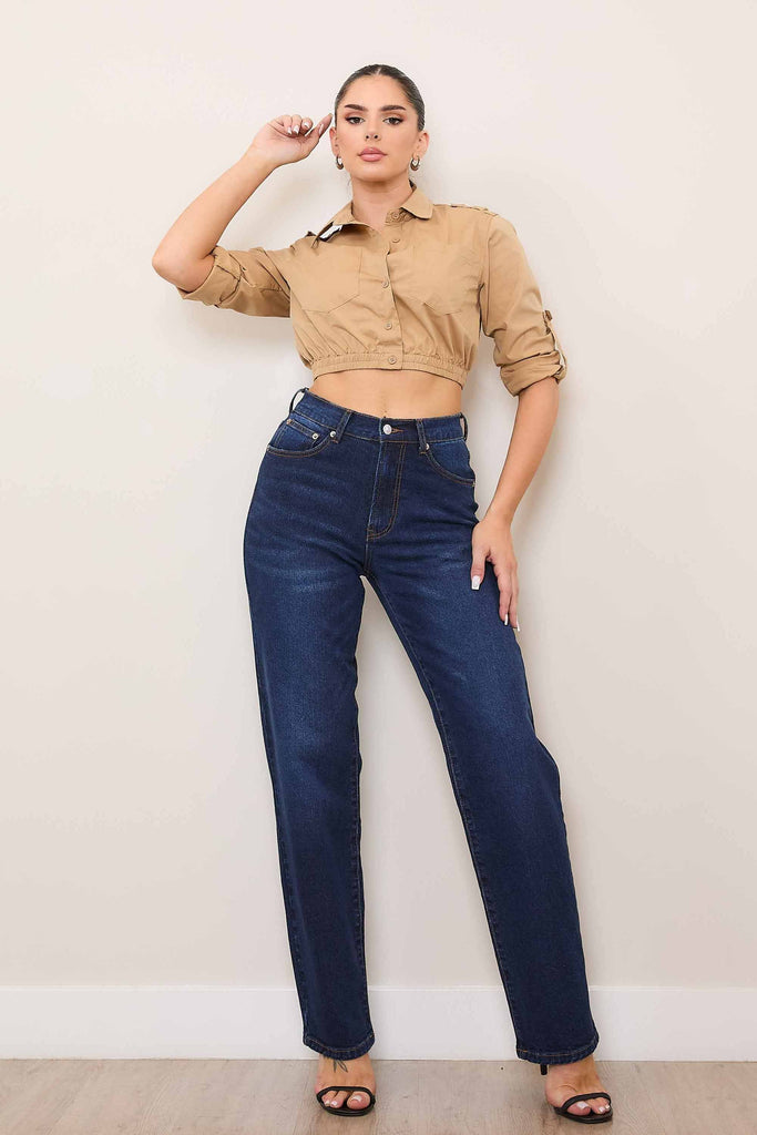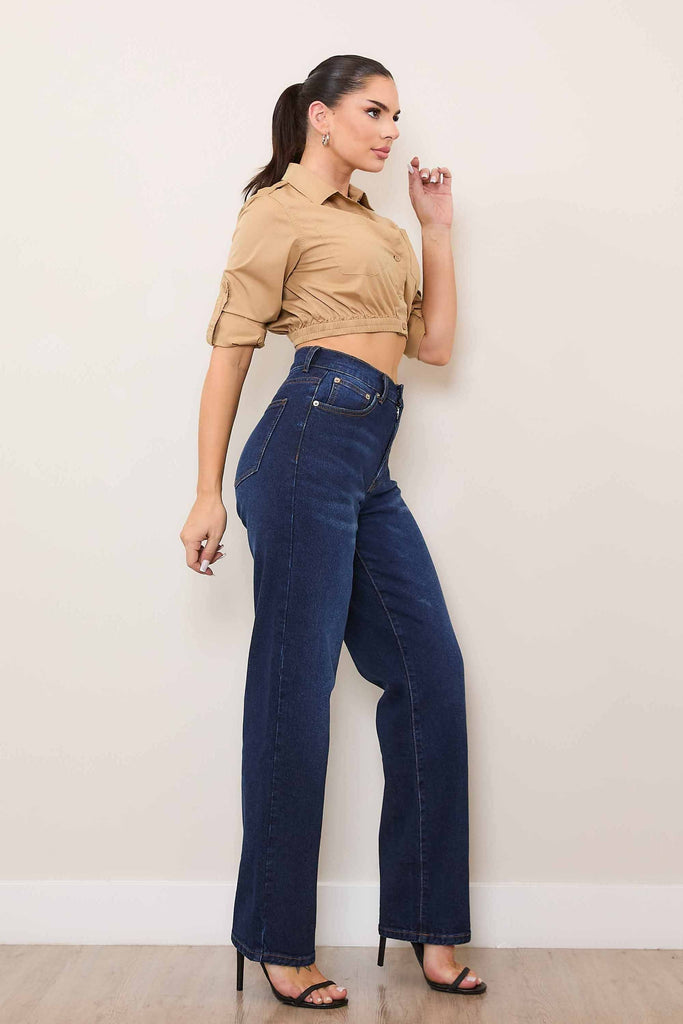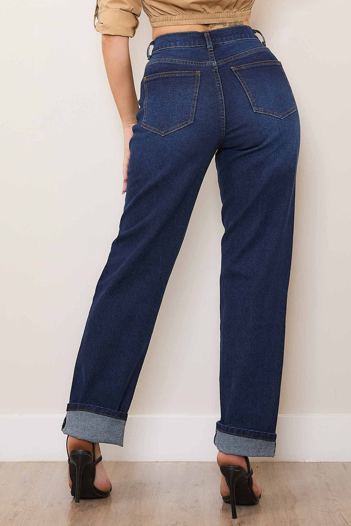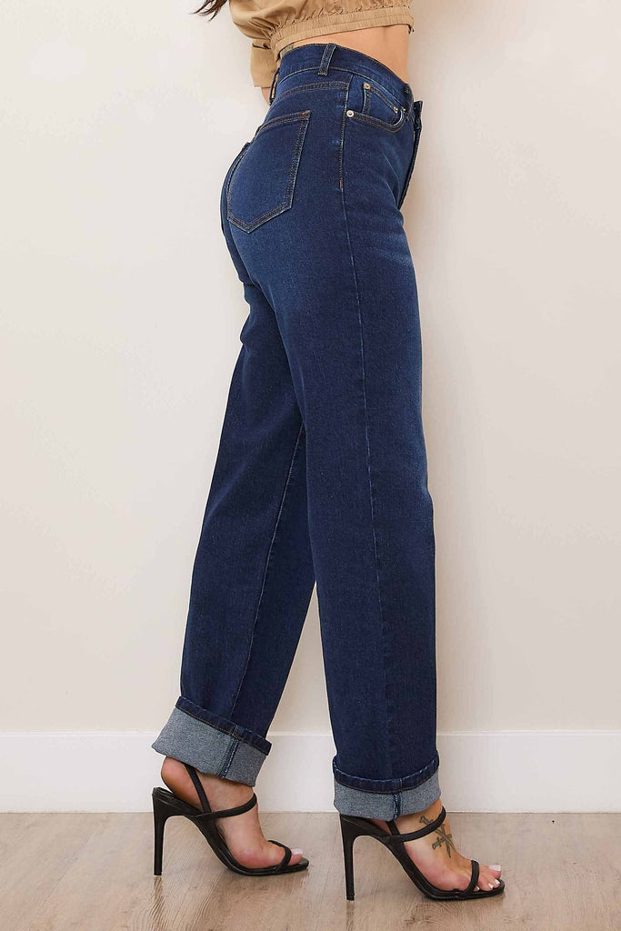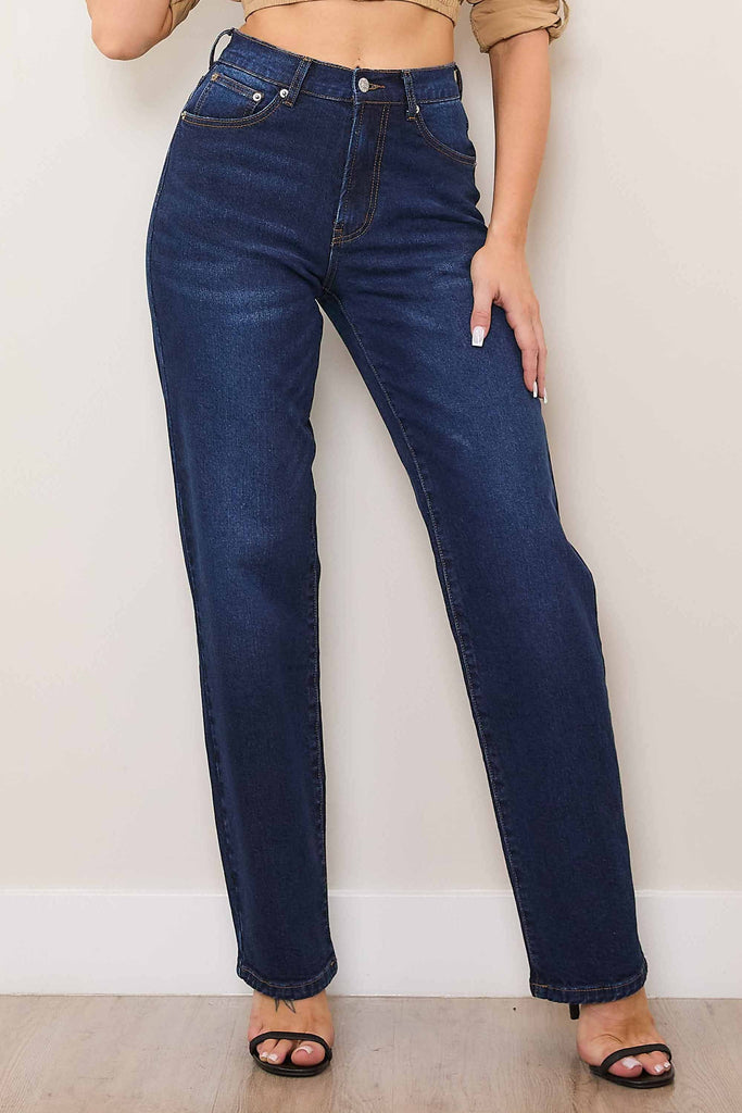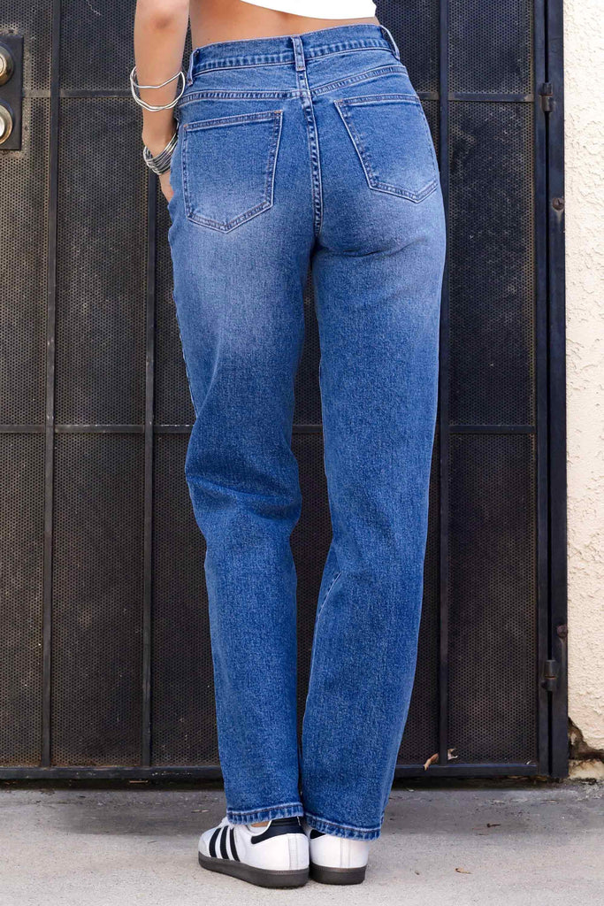 A pair of high-rise 90s slim baggy jeans featuring classic 5-pocket construction and a zip-fly closure.