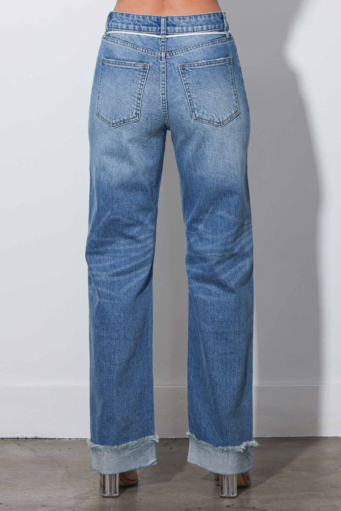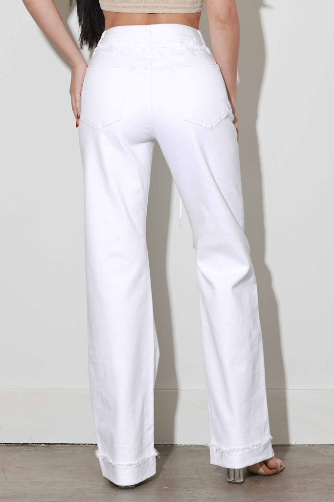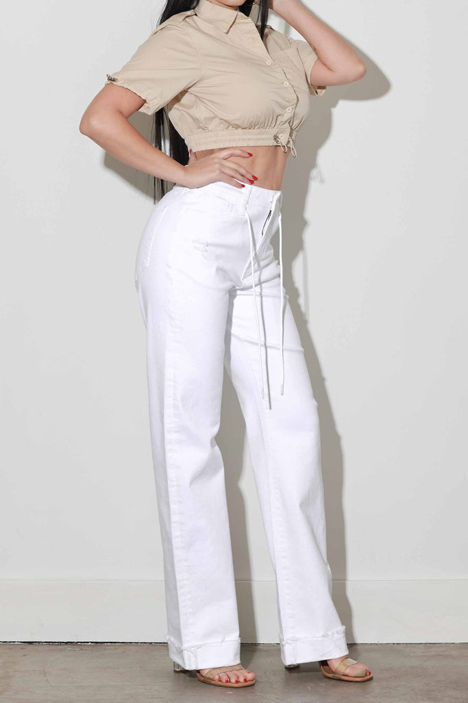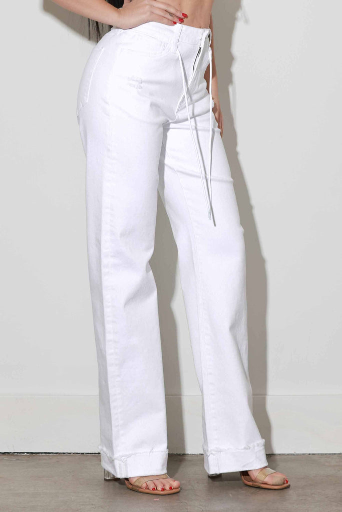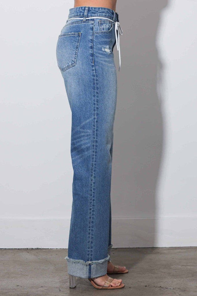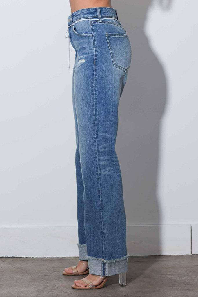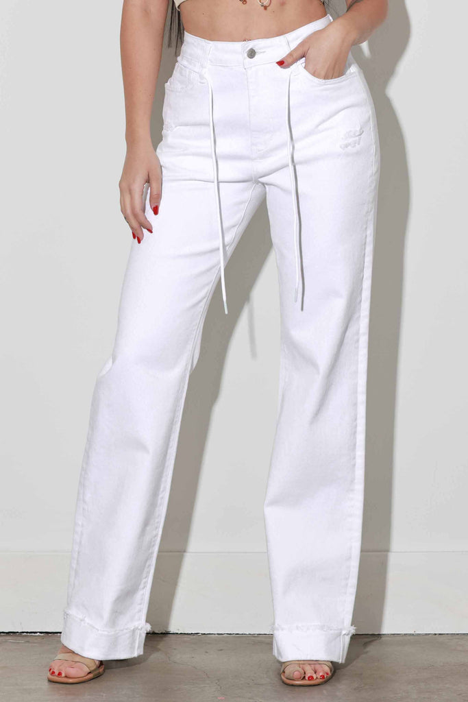 A pair of high-rise straight jeans featuring drawstring on the waist, folded leg openings, subtle distress, classic 5-pocket construction and zip-fly closure.