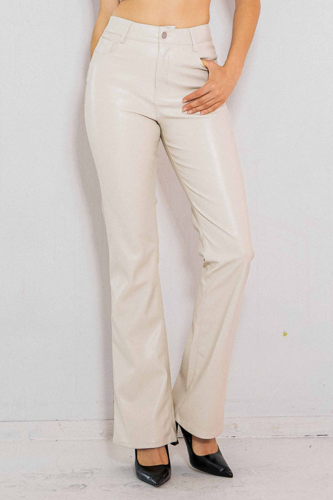 PU faux leather bootcut pants featuring a 5-Pocket construction and a zip-fly closure.