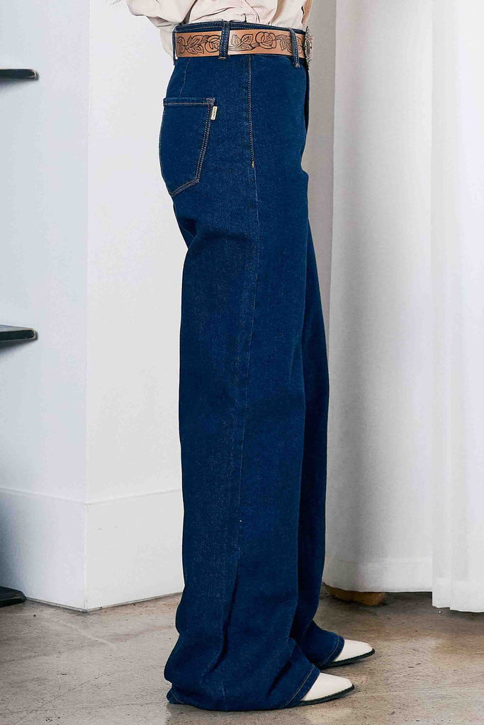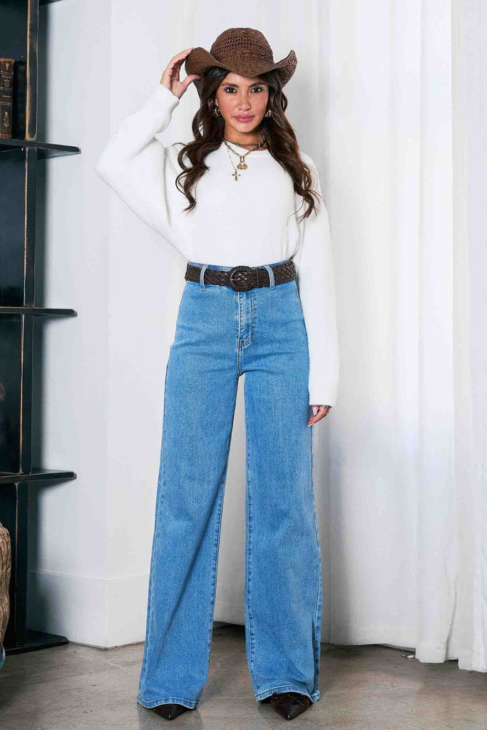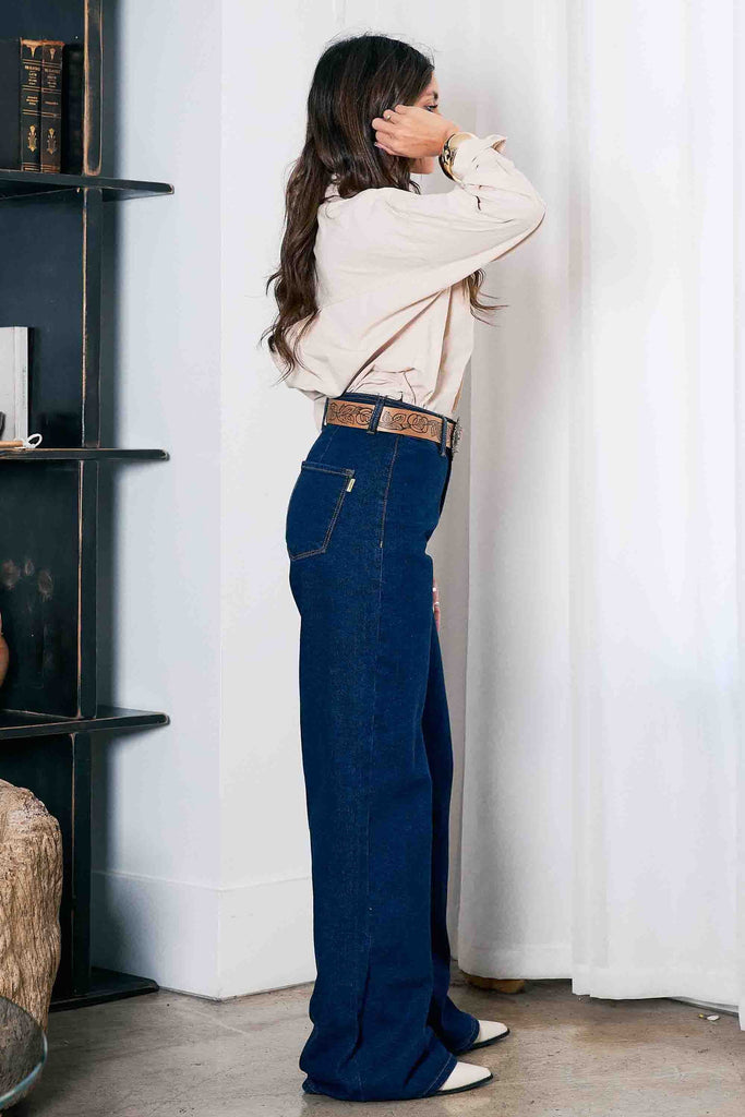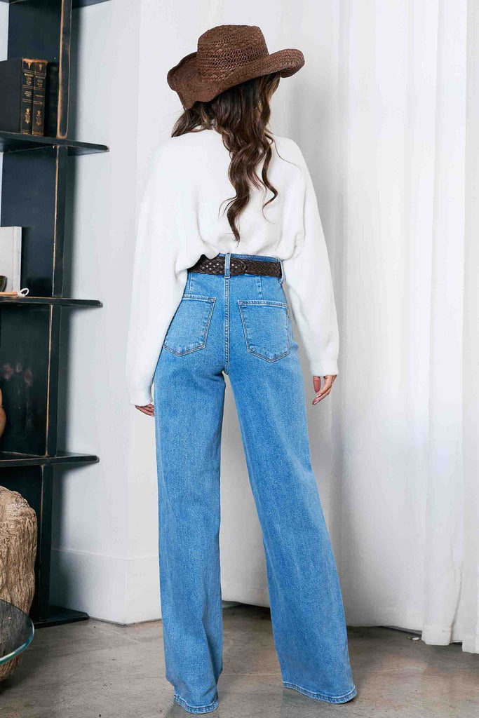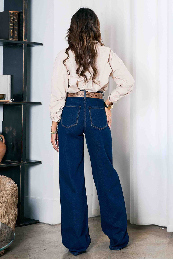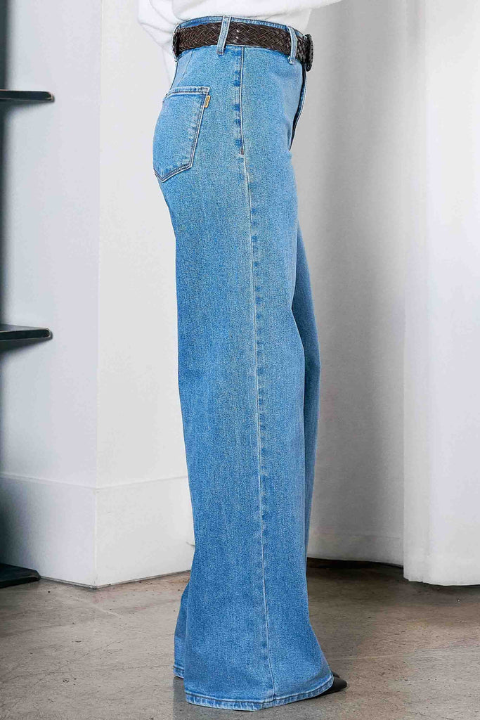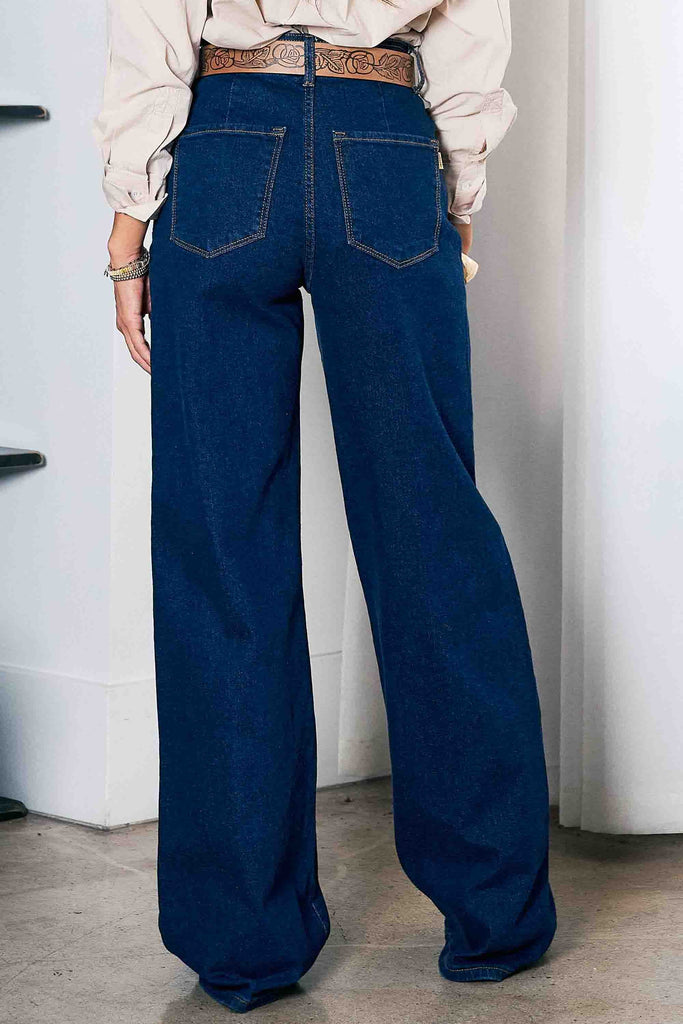 A pair of high-rise wide jeans featuring two back pockets and zip-fly closure.
