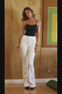 A pair of flare jeans featuring two buttons on the waist, front & back pockets and zip-fly closure.