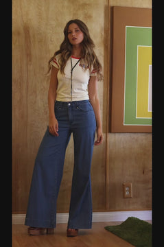 A pair of low rise palazzo jeans featuring 5 pocket construction and zip-fly closure.