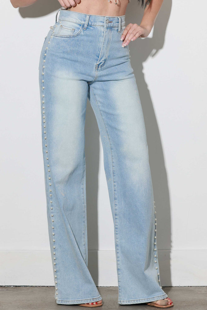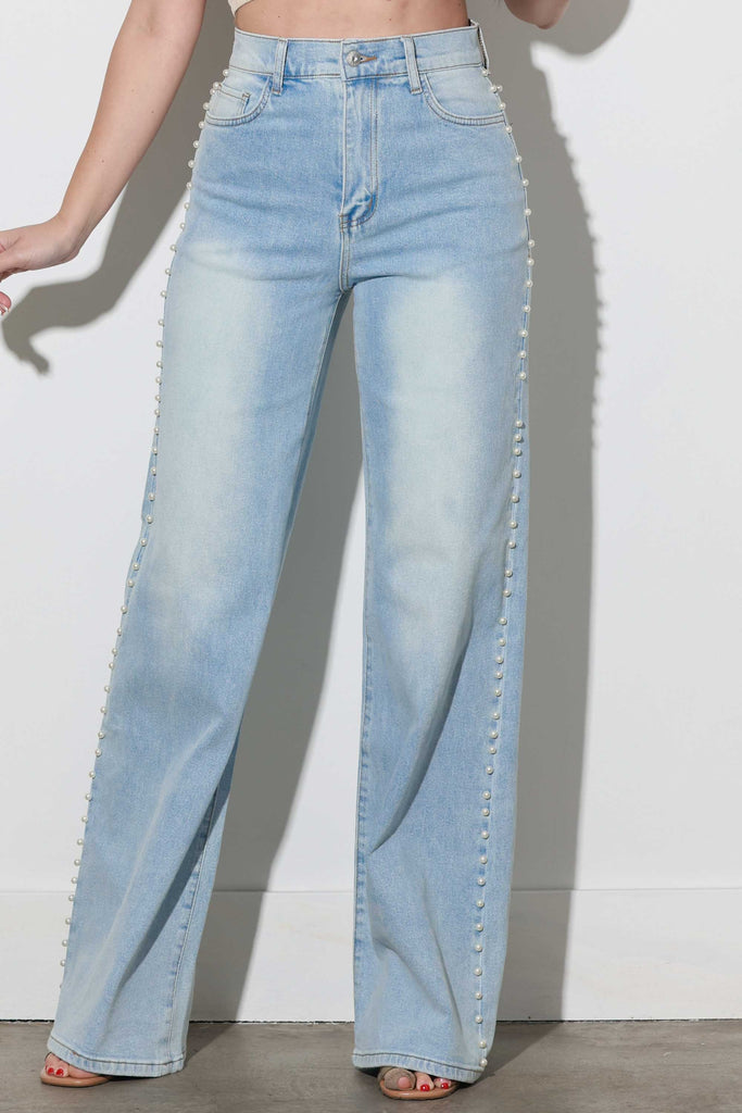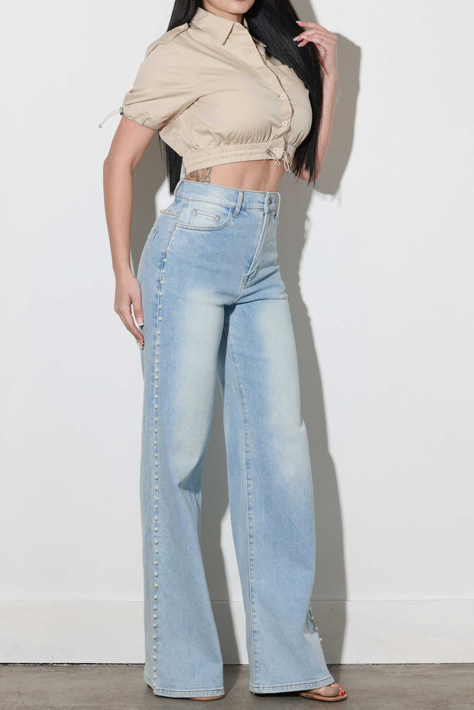 A pair of high-rise wideleg jeans featuring side pearl stud detail, a 5-Pocket construction and zip-fly closure.