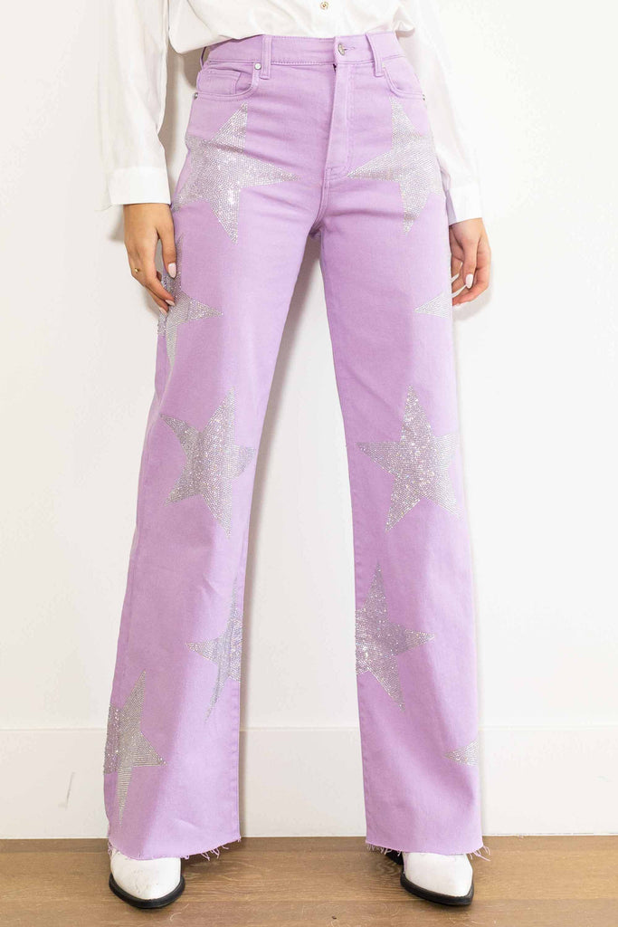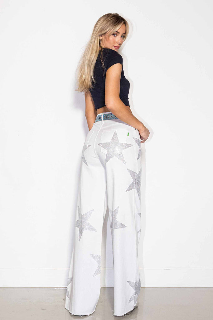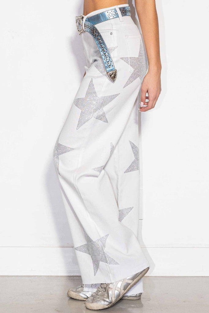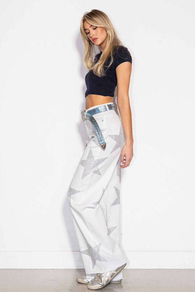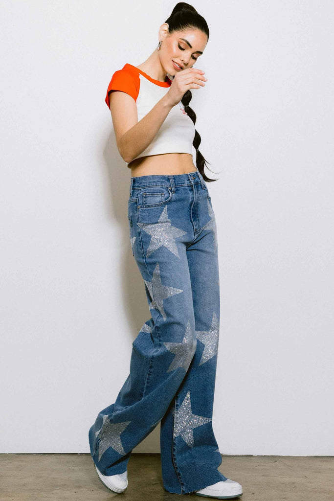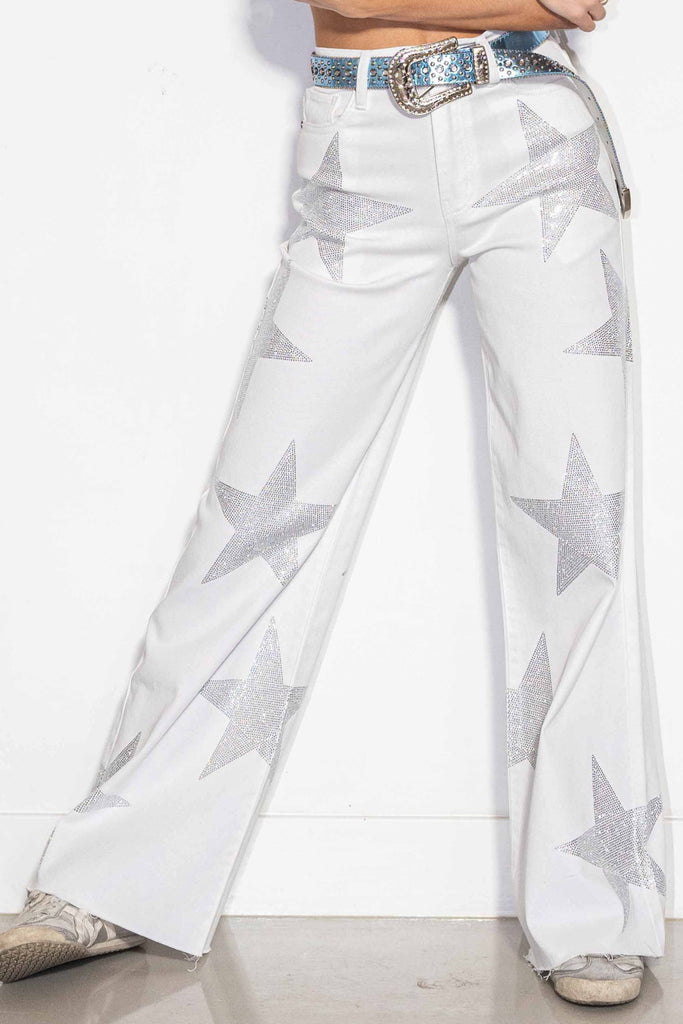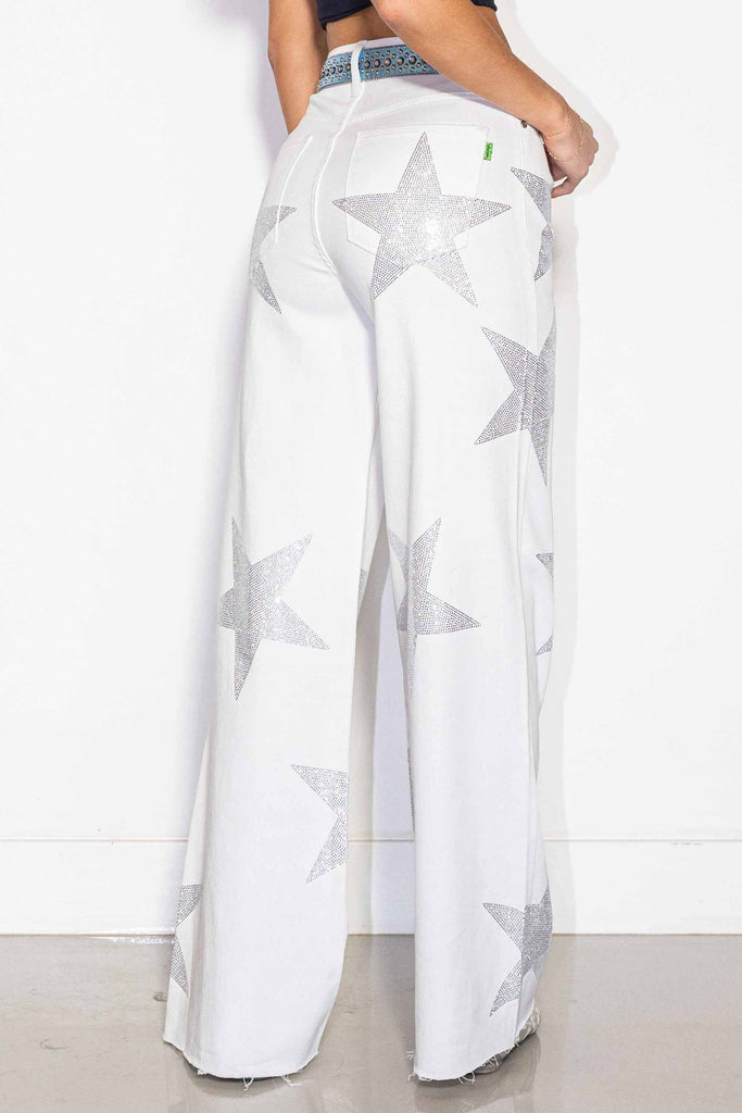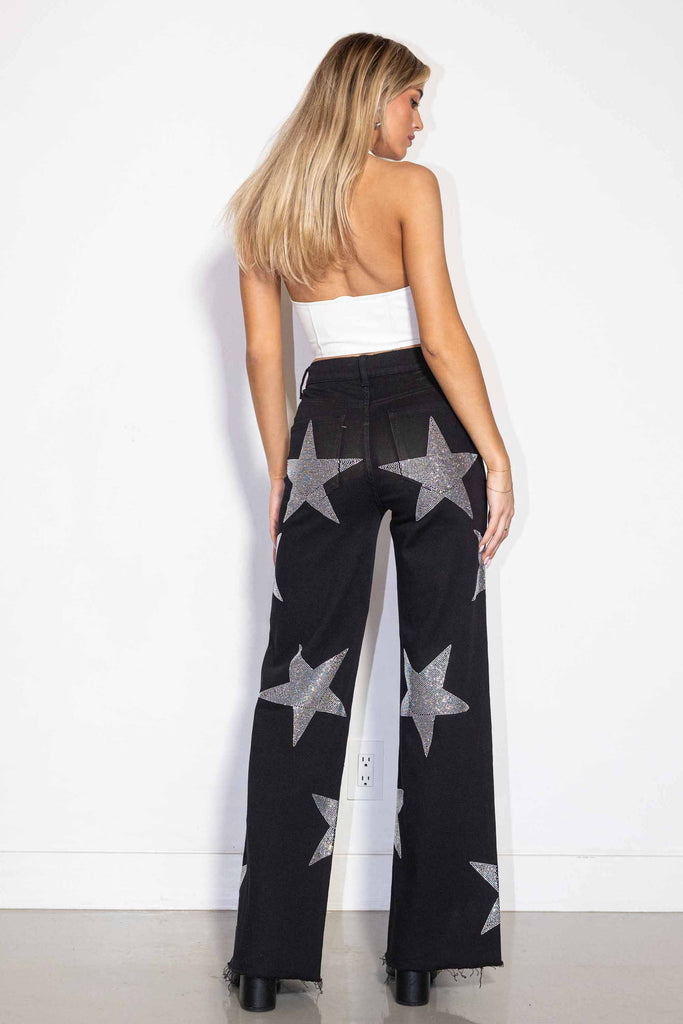 A pair of high-rise wide jeans featuring star shape rhinestone detail, classic 5-pocket construction and zip-fly closure.