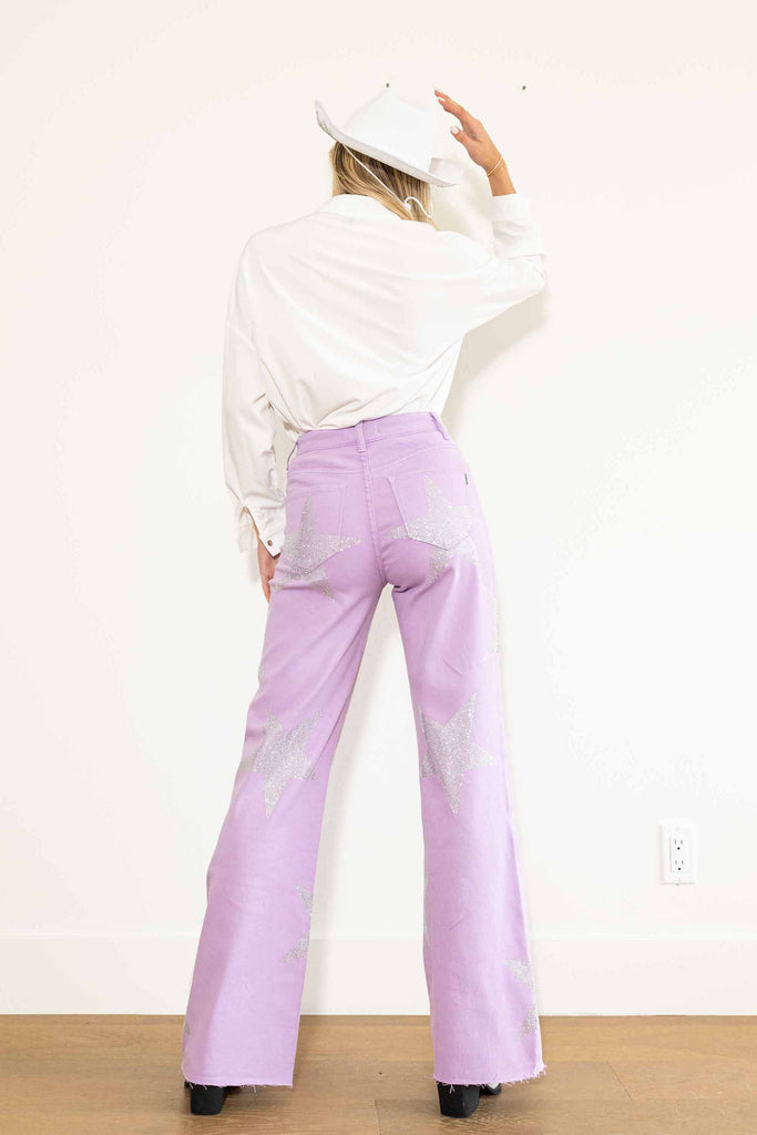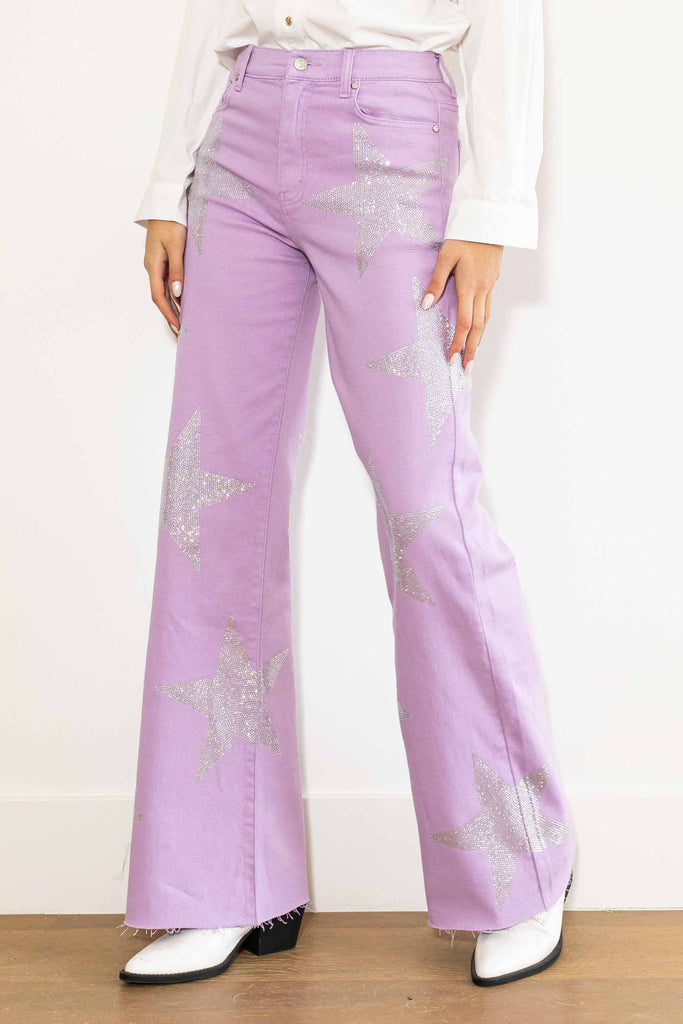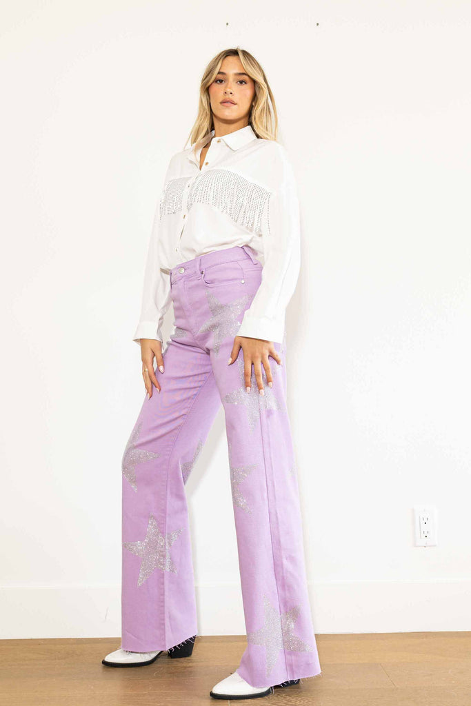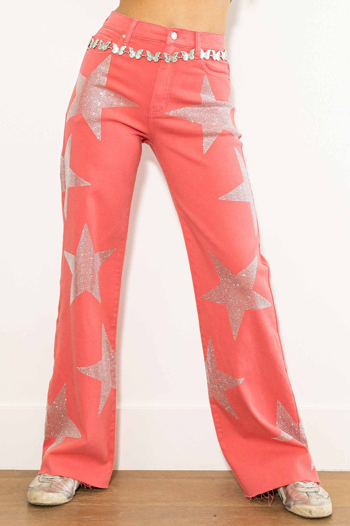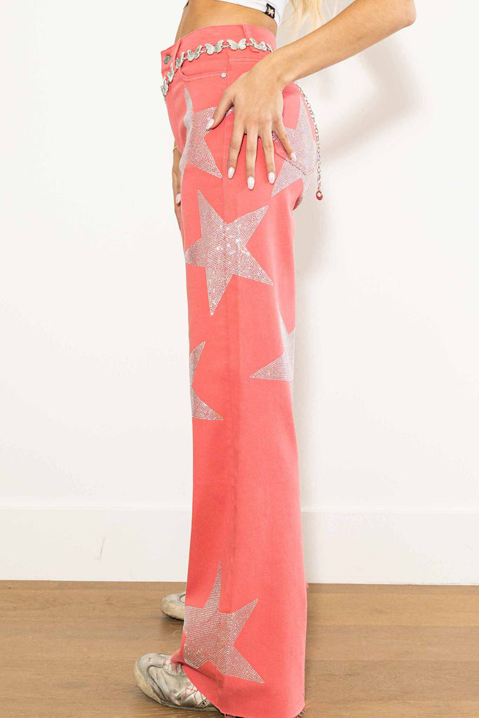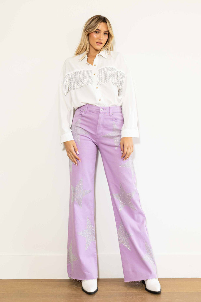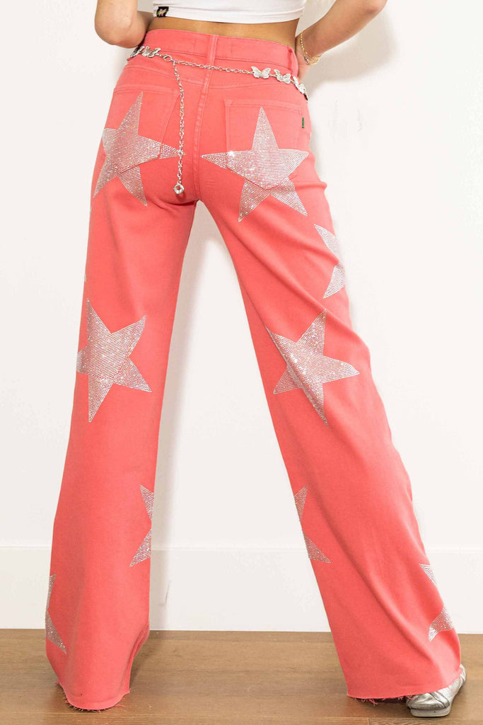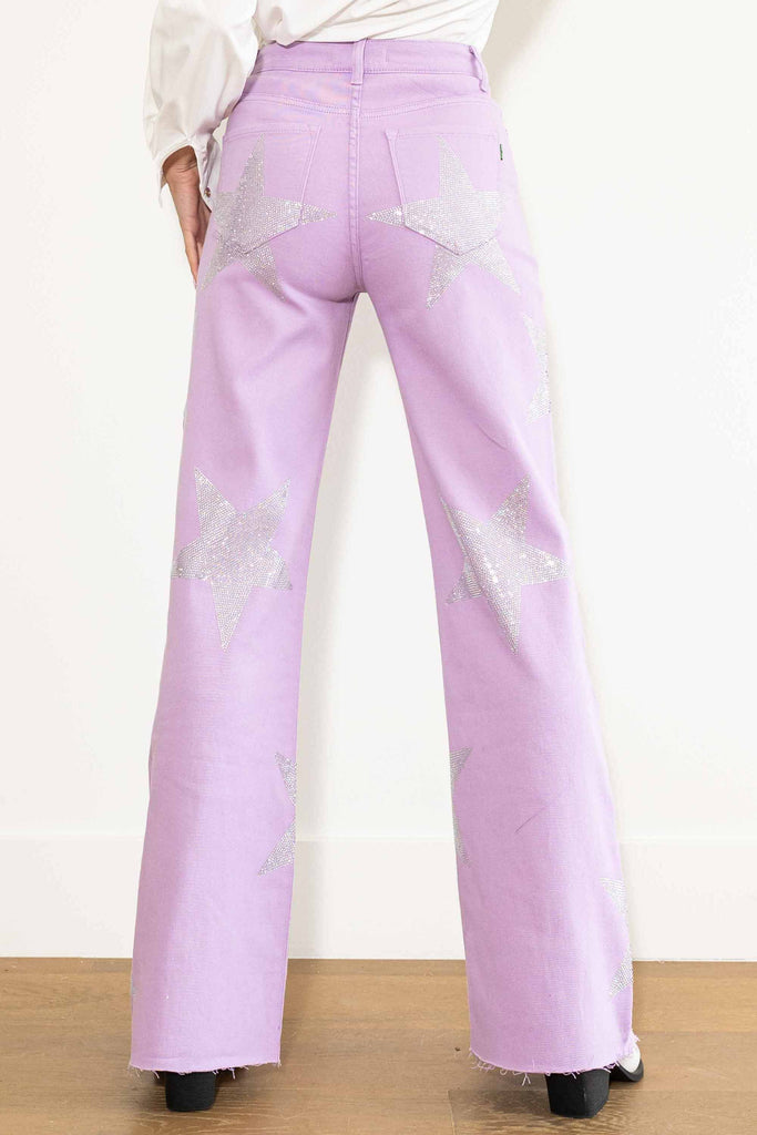 A pair of high-rise wide jeans featuring star shape rhinestone detail, classic 5-pocket construction and zip-fly closure.