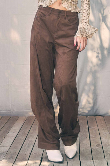 A pair of suede baggy barrel jeans featuring adjustable snap buttons on the leg opening, rouched detail on the back, front & back pockets and zip-fly closure.